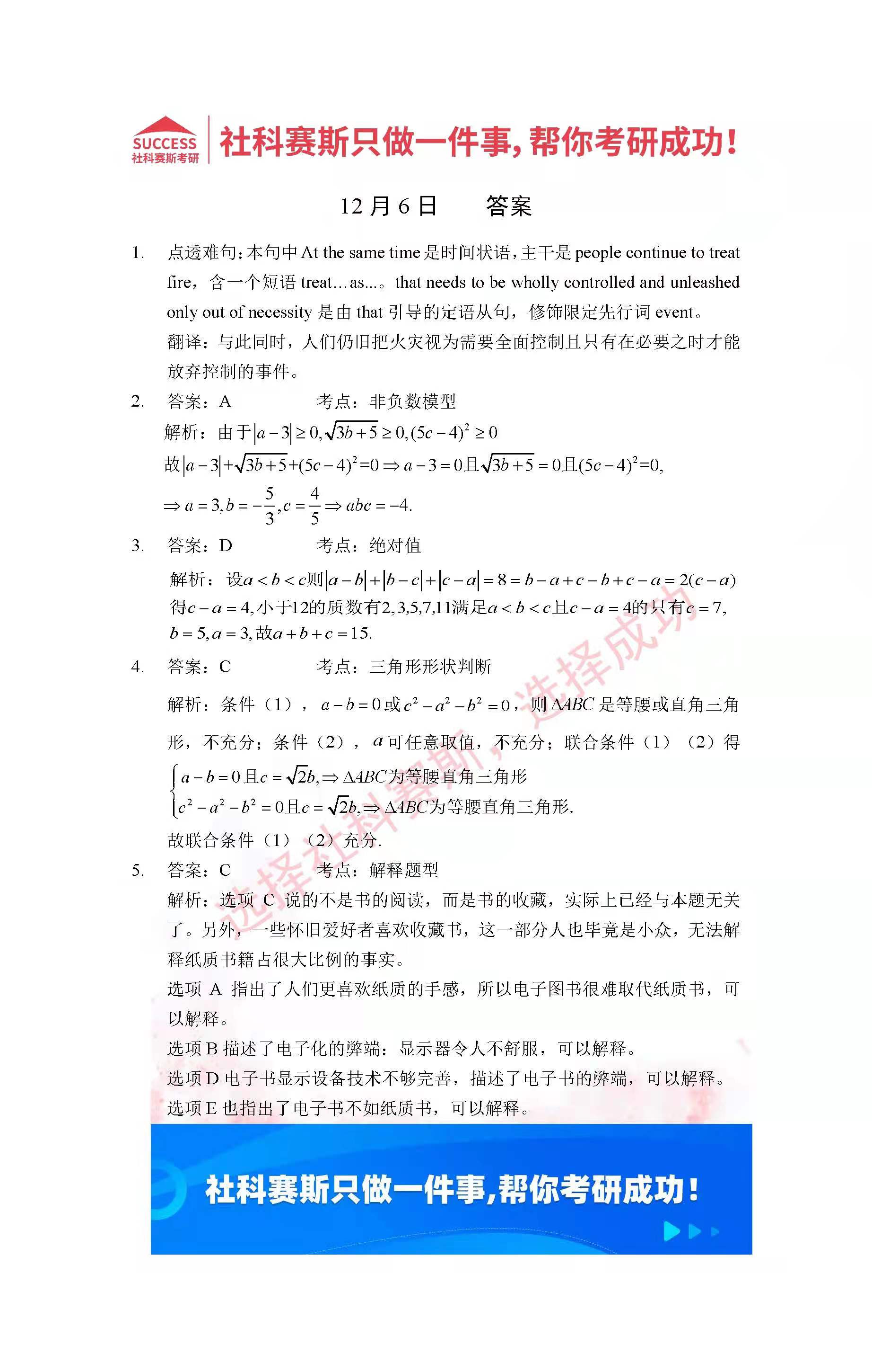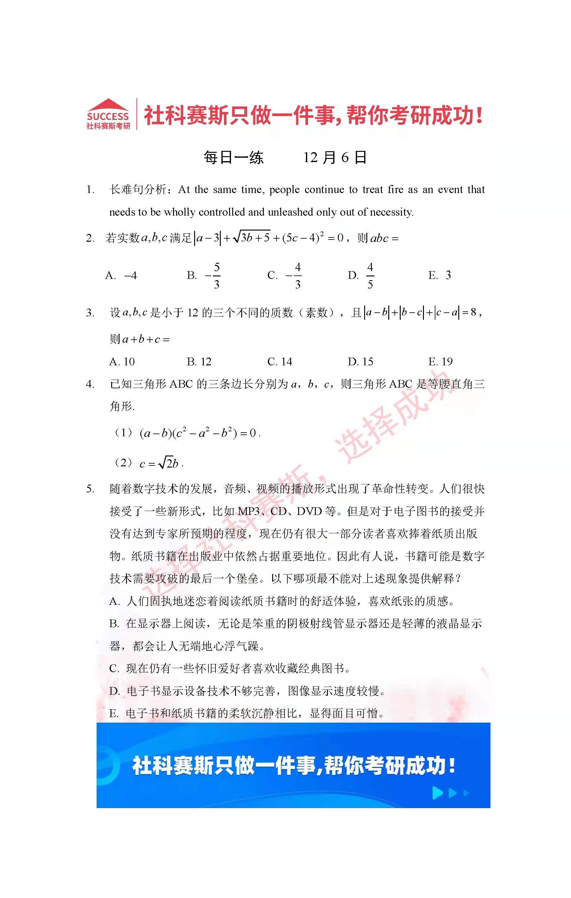 導(dǎo)讀:考研是一場持久戰(zhàn),保持良好的學(xué)習(xí)習(xí)慣,是能確保復(fù)習(xí)高效的關(guān)鍵。今天社科賽斯MBA備考網(wǎng)小編整理了“2022管理類聯(lián)考12月6日每日一練及答案”的內(nèi)容,希望能對廣大考生有所幫助。