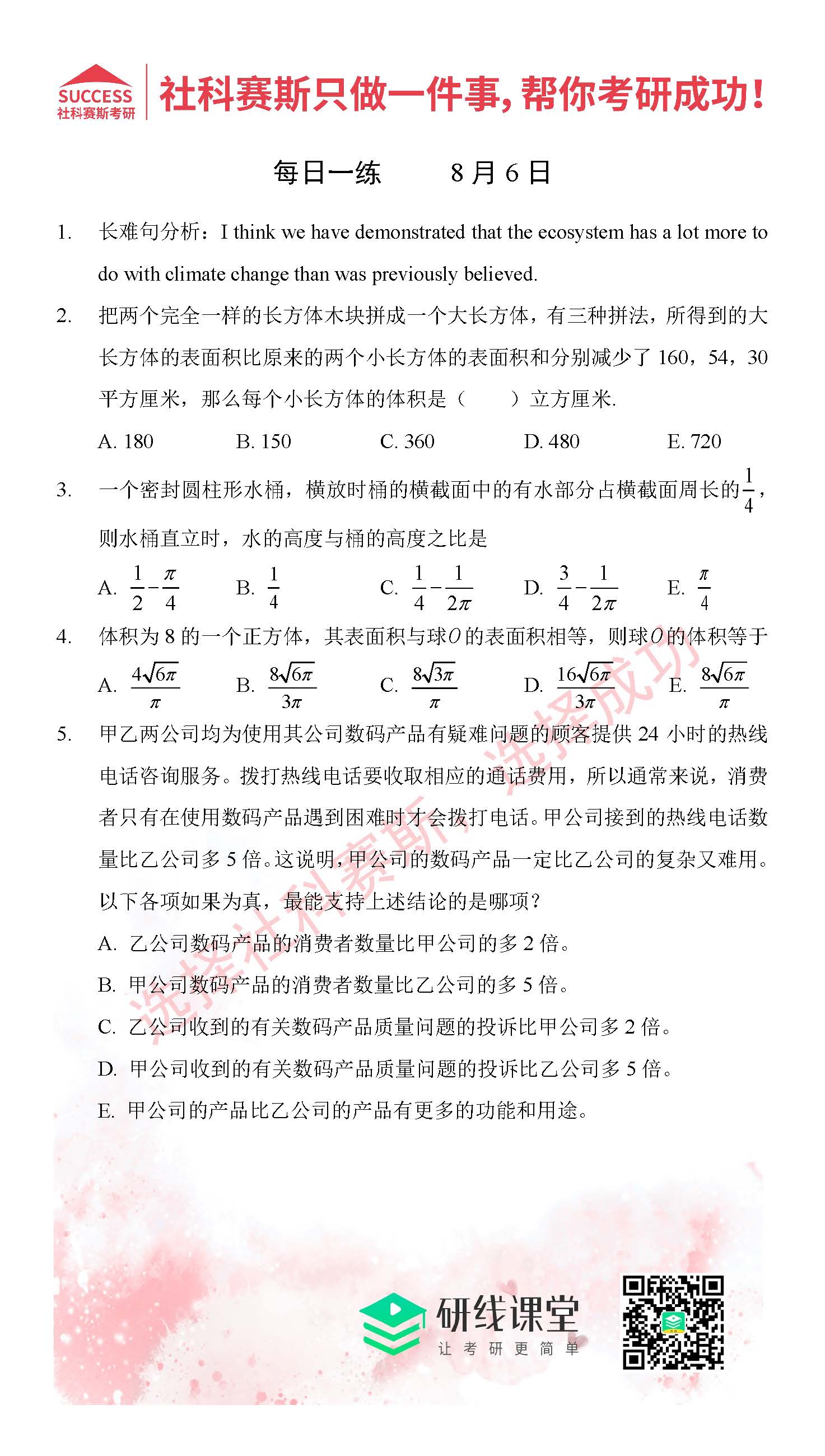 以上就是MBA備考網小編為大家提供的今日每日一練“2021管理類聯考8月6日每日一練及答案”的全部內容,希望各位考生堅持利用起來,更多每日一練內容請持續關注MBA備考網管理類聯考每日一練