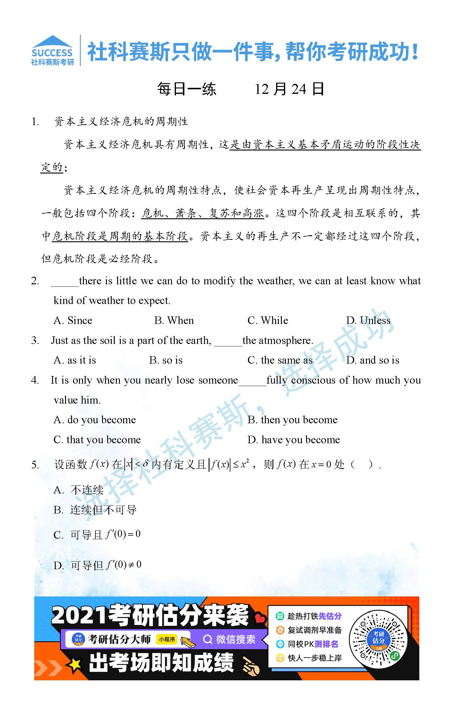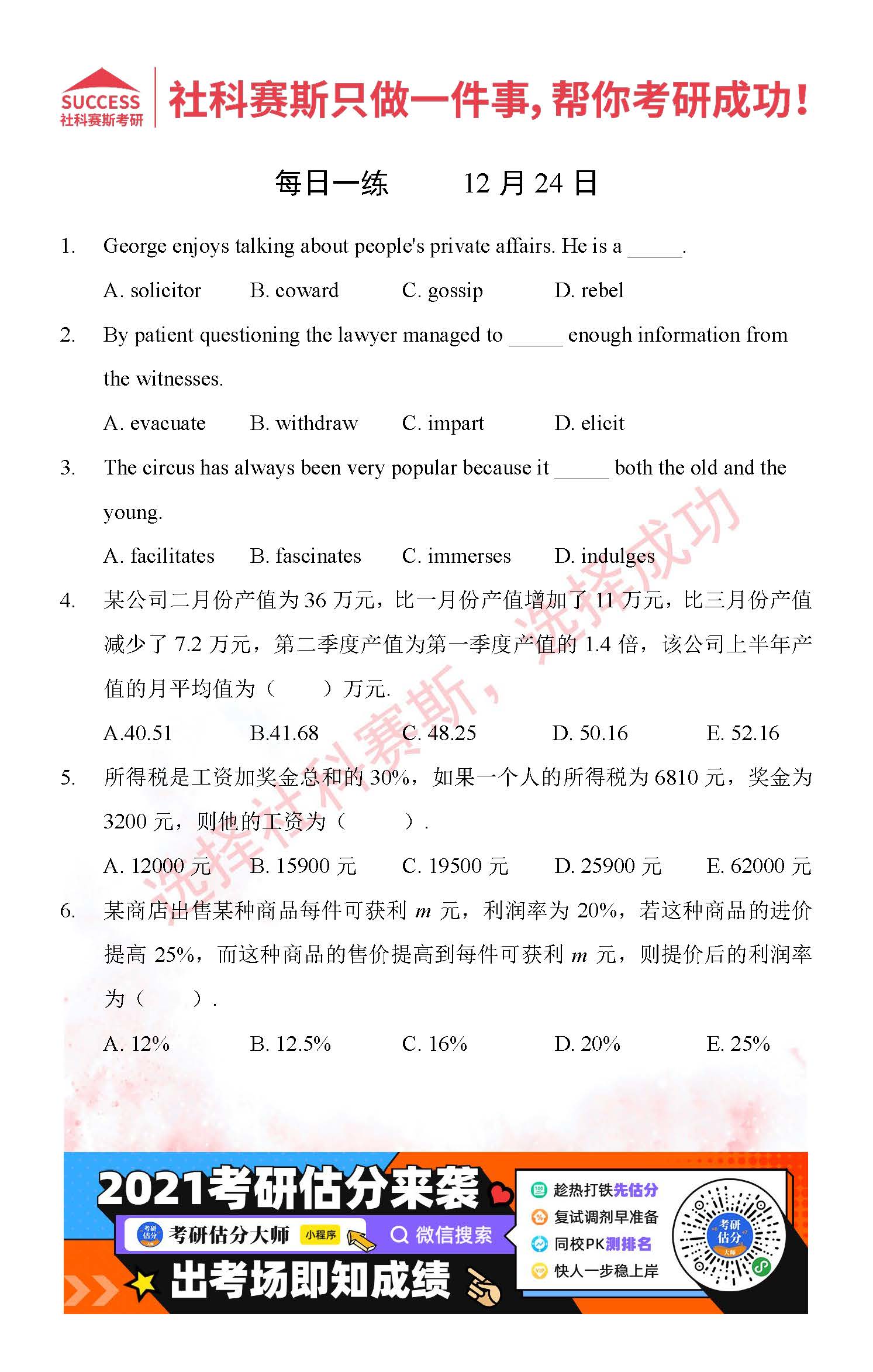 導(dǎo)讀:考研是一場持久戰(zhàn),保持良好的學(xué)習(xí)習(xí)慣,是能確保復(fù)習(xí)高效的關(guān)鍵。今天社科賽斯MBA備考網(wǎng)小編整理了“2021管理類聯(lián)12月24日每日一練及答案”的內(nèi)容,希望能對廣大考生有所幫助。