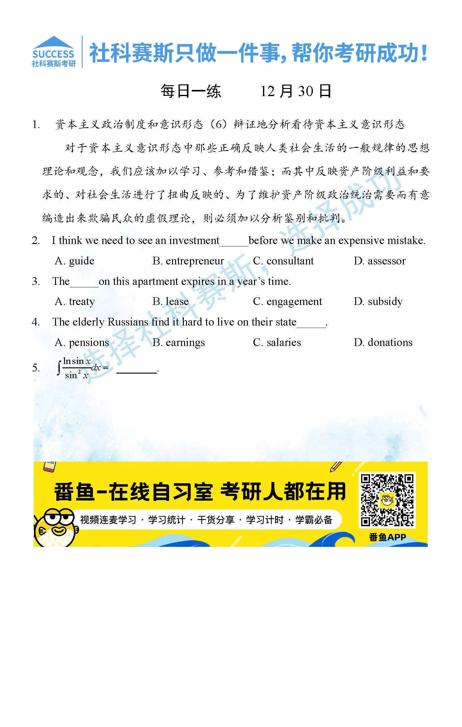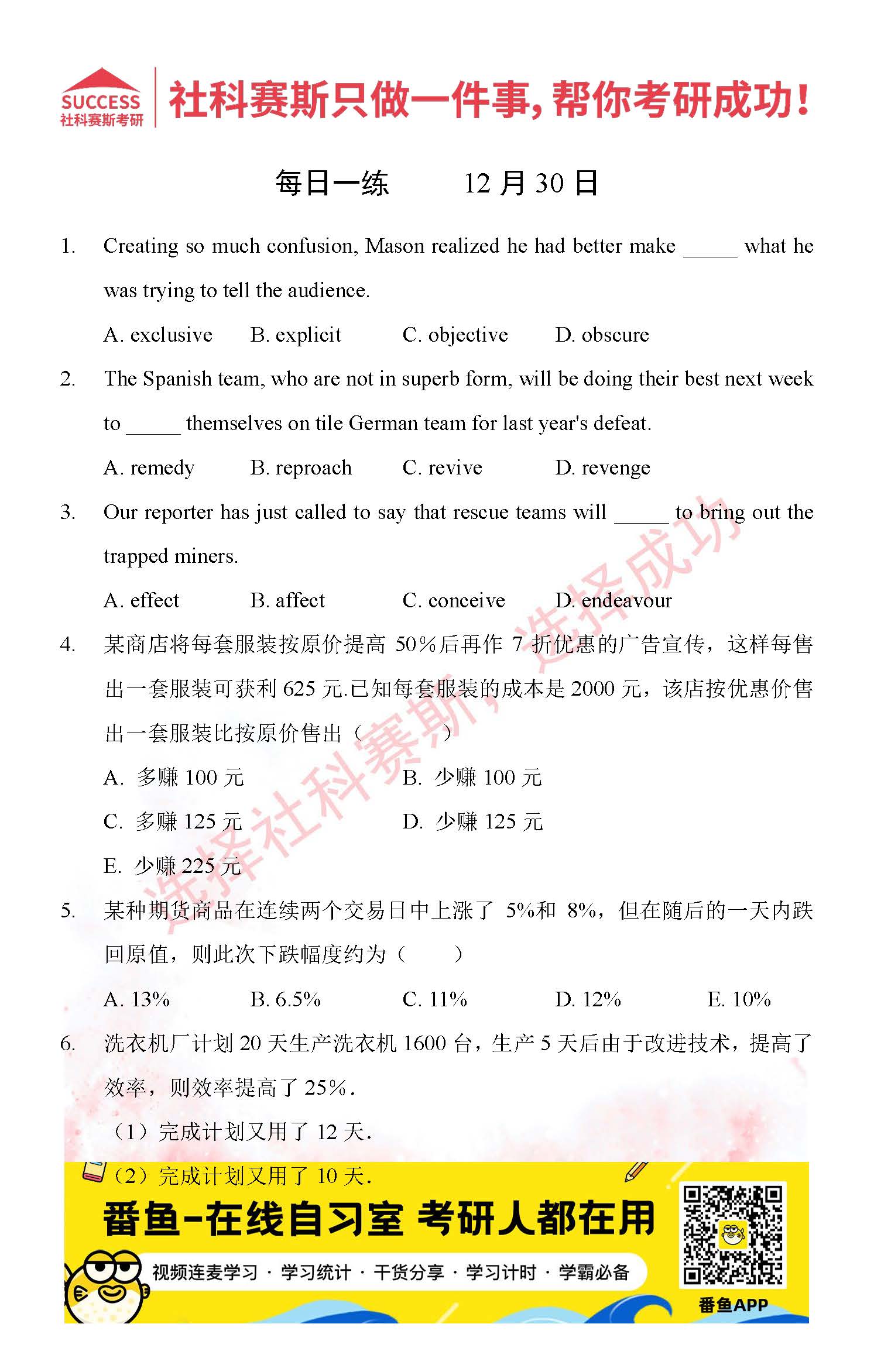 導(dǎo)讀:考研是一場(chǎng)持久戰(zhàn),保持良好的學(xué)習(xí)習(xí)慣,是能確保復(fù)習(xí)高效的關(guān)鍵。今天社科賽斯MBA備考網(wǎng)小編整理了“2021管理類聯(lián)12月30日每日一練及答案”的內(nèi)容,希望能對(duì)廣大考生有所幫助。