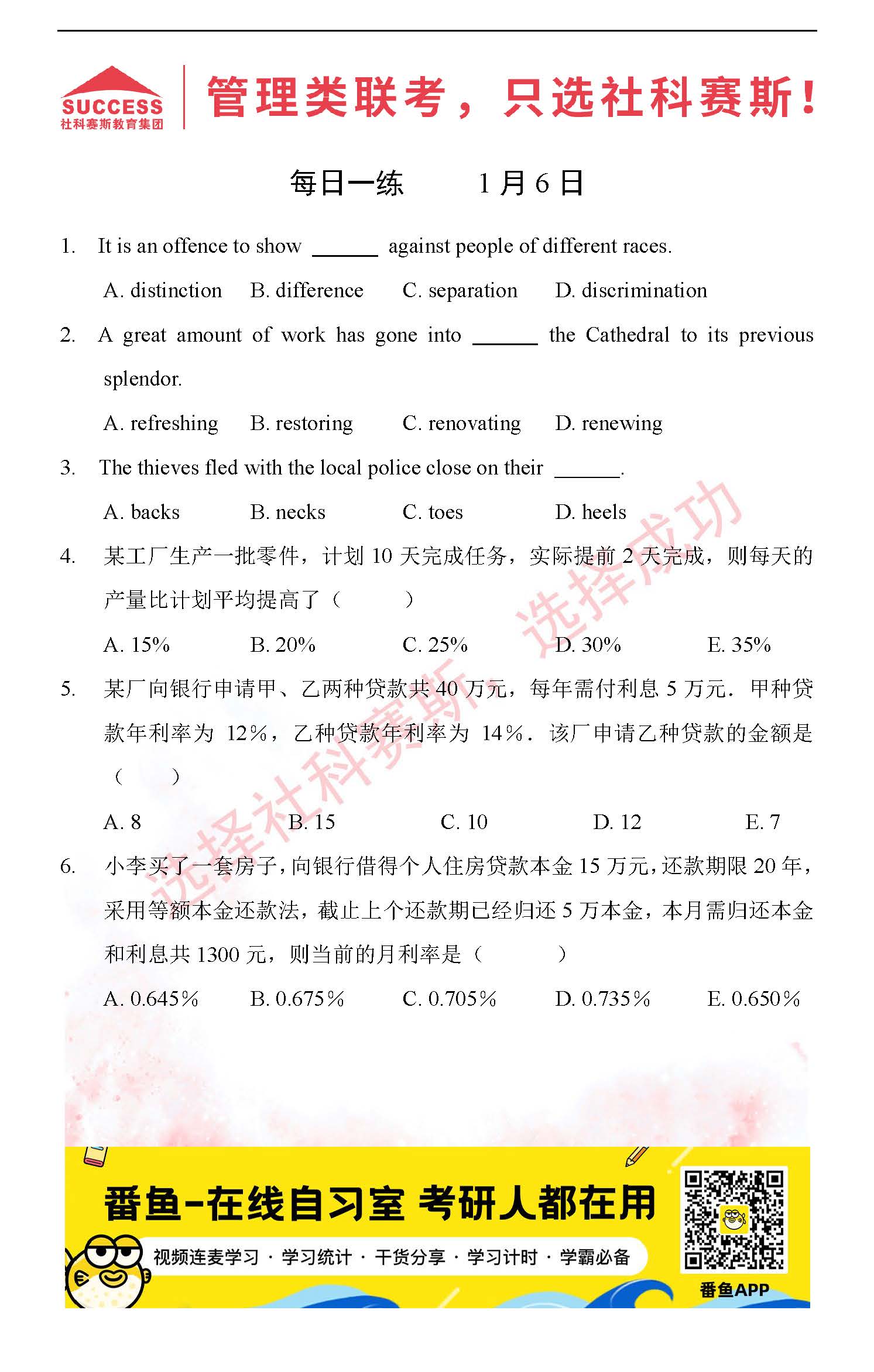 導讀:考研是一場持久戰,保持良好的學習習慣,是能確保復習高效的關鍵。今天社科賽斯MBA備考網小編整理了“2022管理類聯1月6日每日一練及答案”的內容,希望能對廣大考生有所幫助。