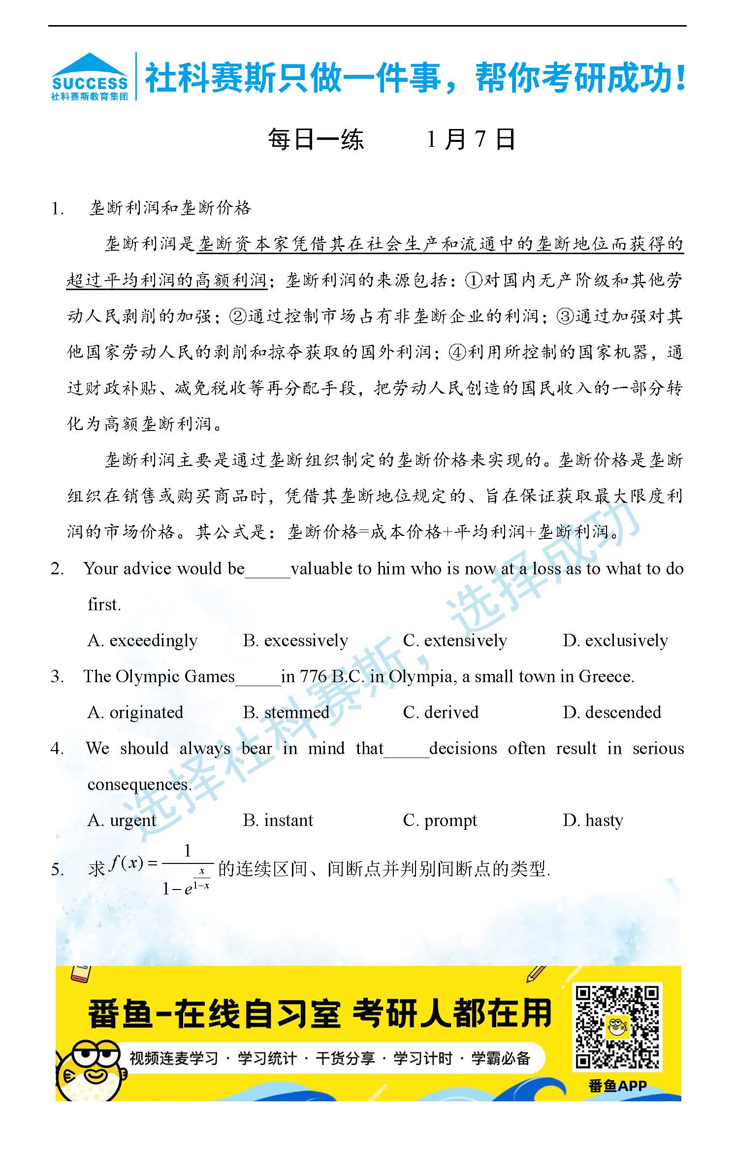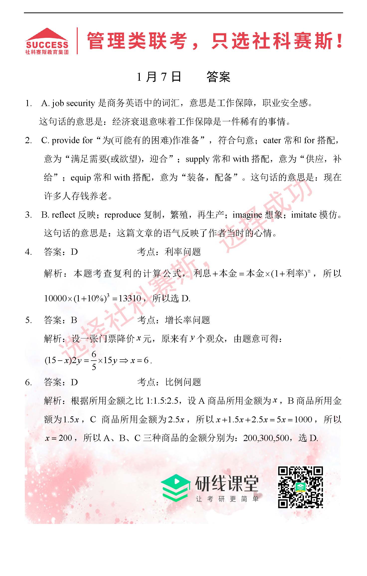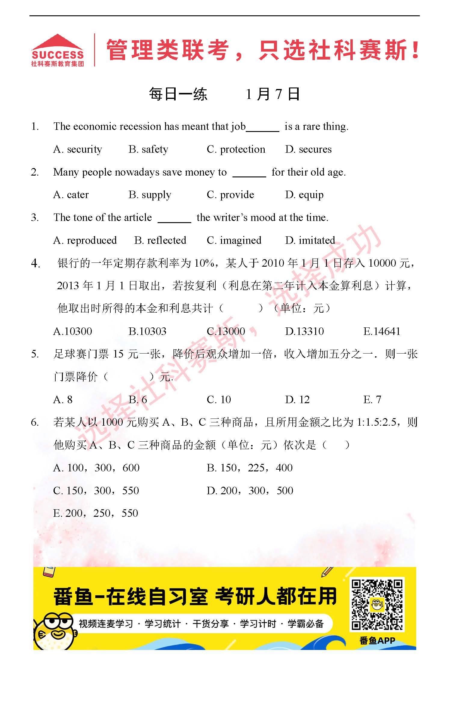 導(dǎo)讀:考研是一場(chǎng)持久戰(zhàn),保持良好的學(xué)習(xí)習(xí)慣,是能確保復(fù)習(xí)高效的關(guān)鍵。今天社科賽斯MBA備考網(wǎng)小編整理了“2022管理類聯(lián)1月7日每日一練及答案”的內(nèi)容,希望能對(duì)廣大考生有所幫助。