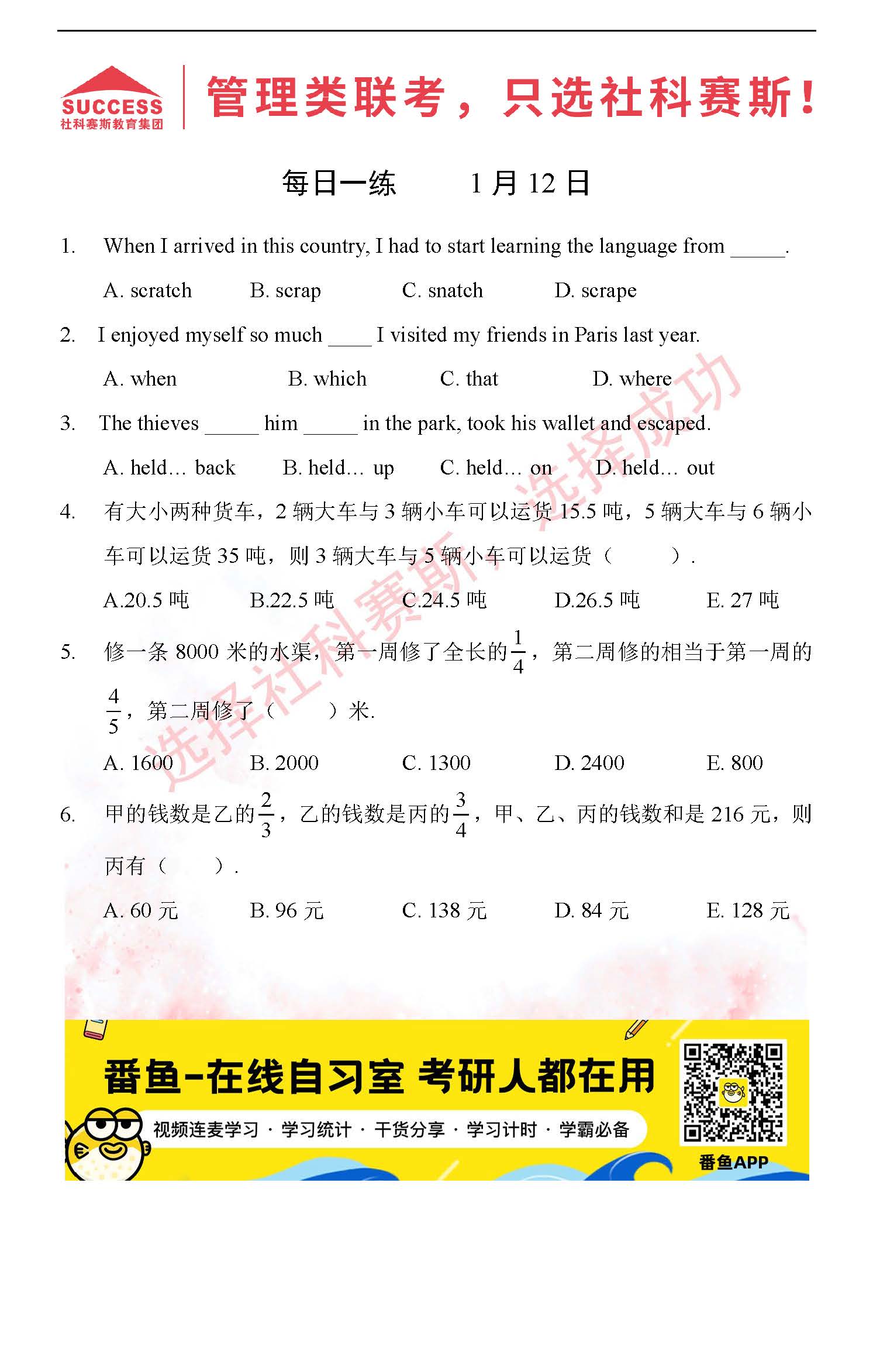 導讀:考研是一場持久戰,保持良好的學習習慣,是能確保復習高效的關鍵。今天社科賽斯MBA備考網小編整理了“2022管理類聯1月12日每日一練及答案”的內容,希望能對廣大考生有所幫助。