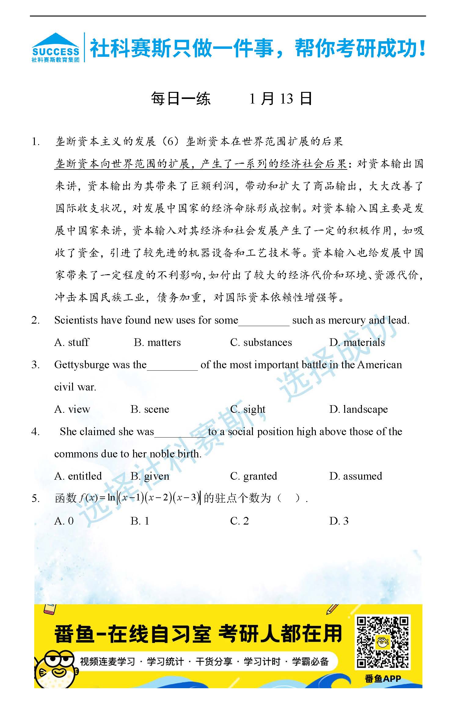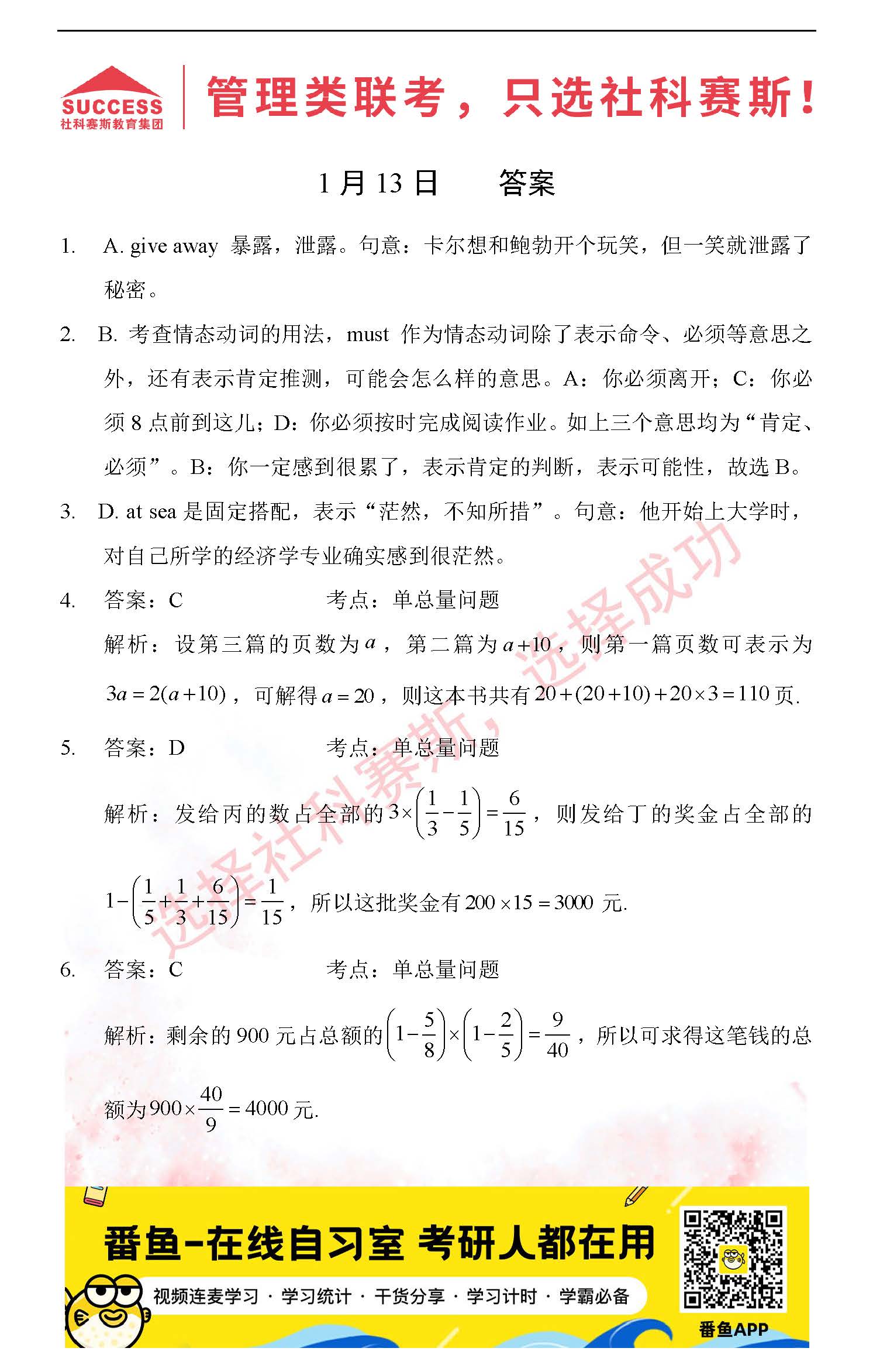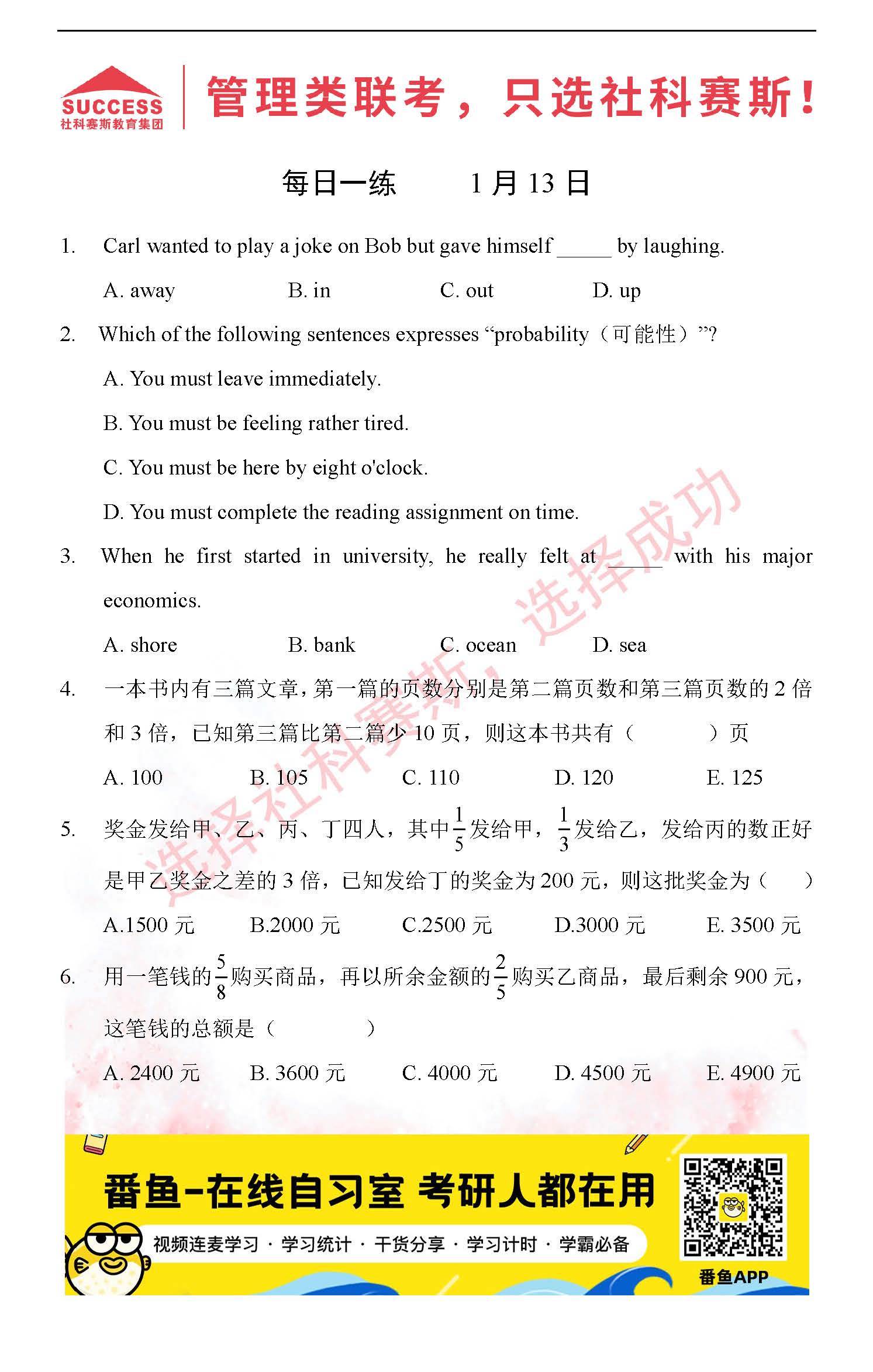 導(dǎo)讀:考研是一場(chǎng)持久戰(zhàn),保持良好的學(xué)習(xí)習(xí)慣,是能確保復(fù)習(xí)高效的關(guān)鍵。今天社科賽斯MBA備考網(wǎng)小編整理了“2022管理類聯(lián)1月13日每日一練及答案”的內(nèi)容,希望能對(duì)廣大考生有所幫助。