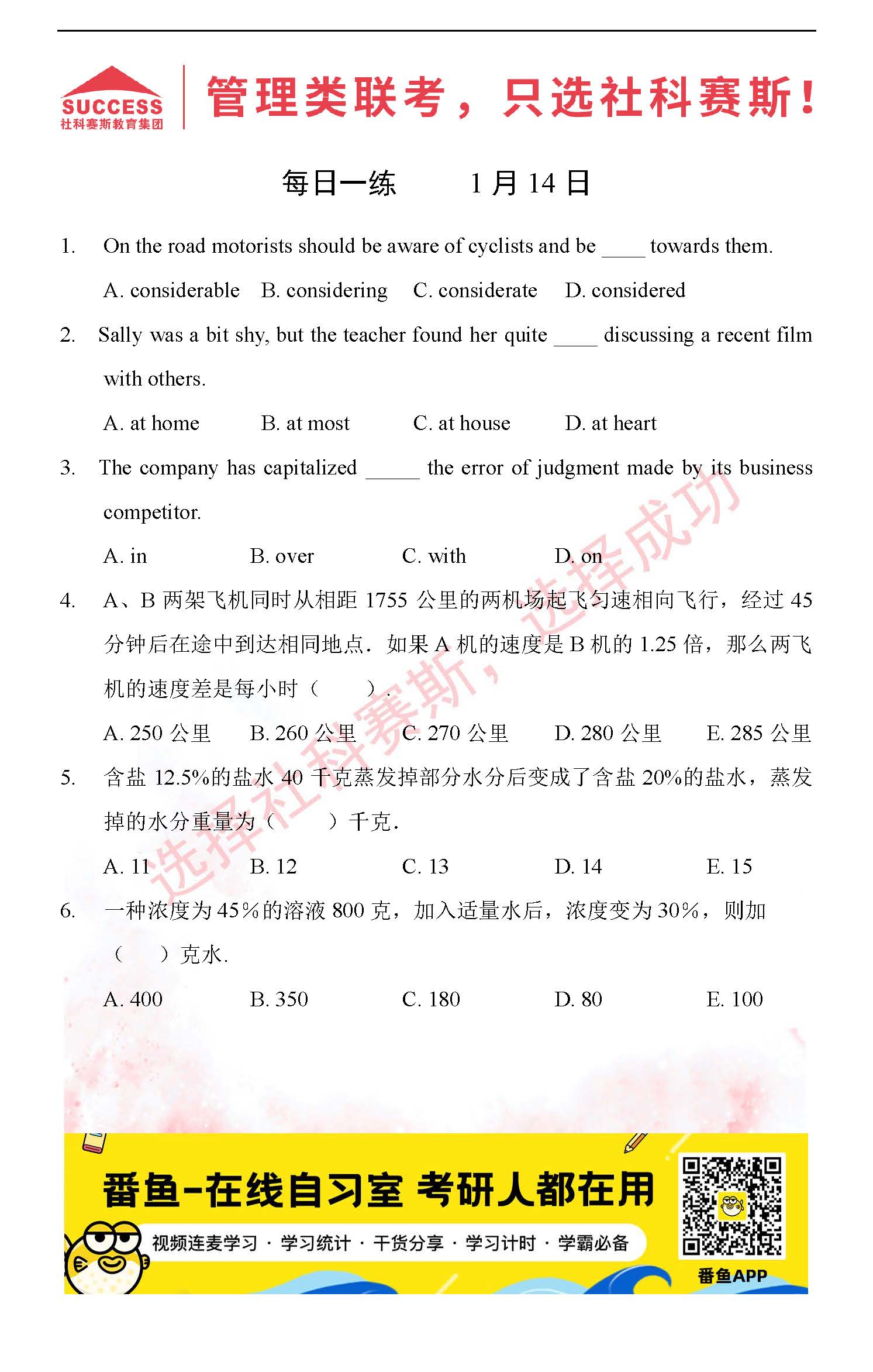 導讀:考研是一場持久戰,保持良好的學習習慣,是能確保復習高效的關鍵。今天社科賽斯MBA備考網小編整理了“2022管理類聯1月14日每日一練及答案”的內容,希望能對廣大考生有所幫助。