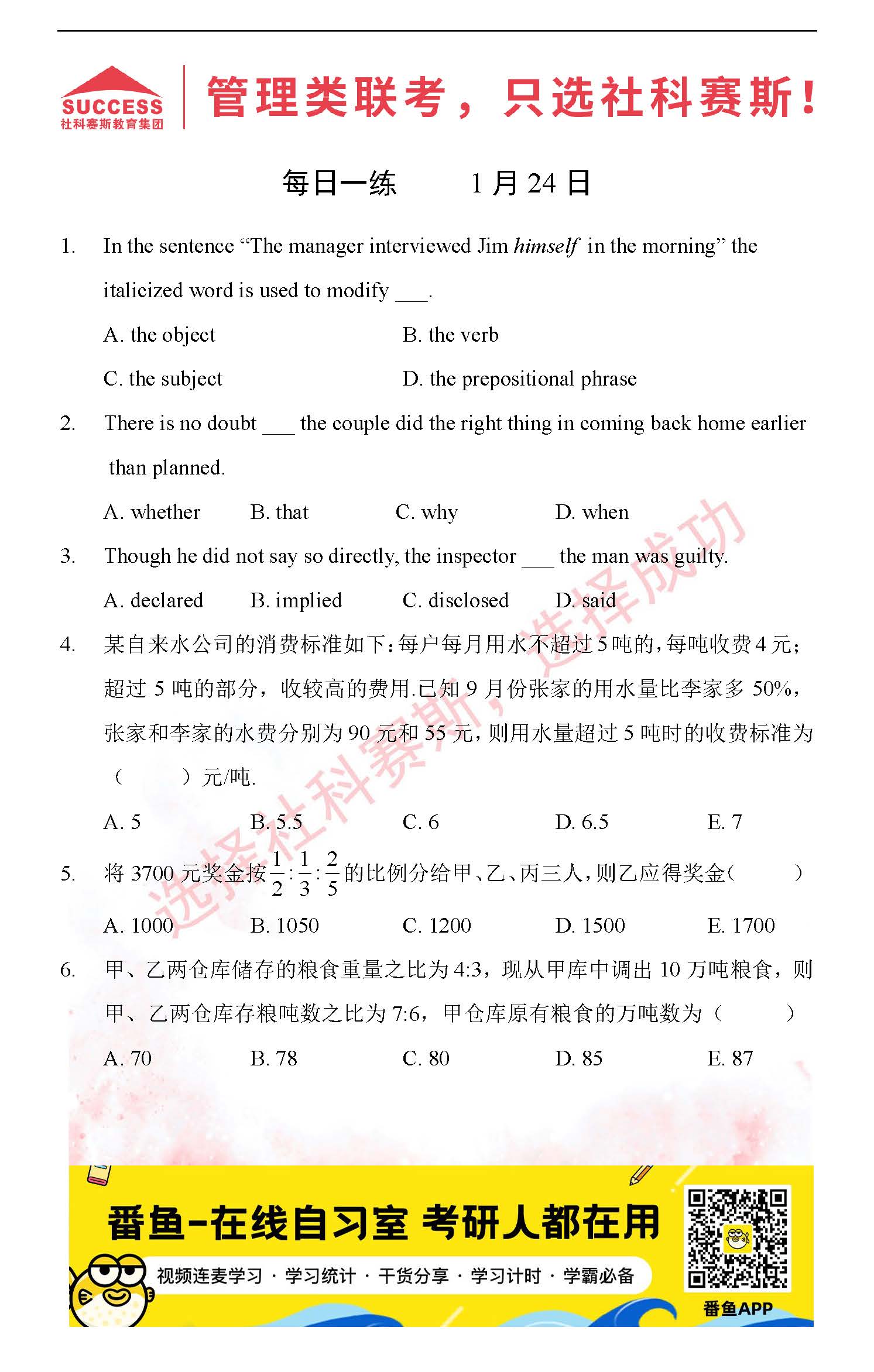 導讀:考研是一場持久戰,保持良好的學習習慣,是能確保復習高效的關鍵。今天社科賽斯MBA備考網小編整理了“2022管理類聯1月24日每日一練及答案”的內容,希望能對廣大考生有所幫助。