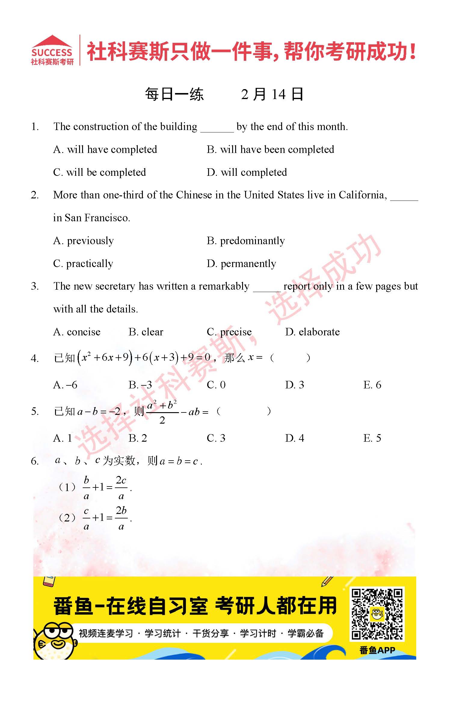 導(dǎo)讀:考研是一場持久戰(zhàn),保持良好的學(xué)習(xí)習(xí)慣,是能確保復(fù)習(xí)高效的關(guān)鍵。今天社科賽斯MBA備考網(wǎng)小編整理了“2022管理類聯(lián)2月14日每日一練及答案”的內(nèi)容,希望能對(duì)廣大考生有所幫助。