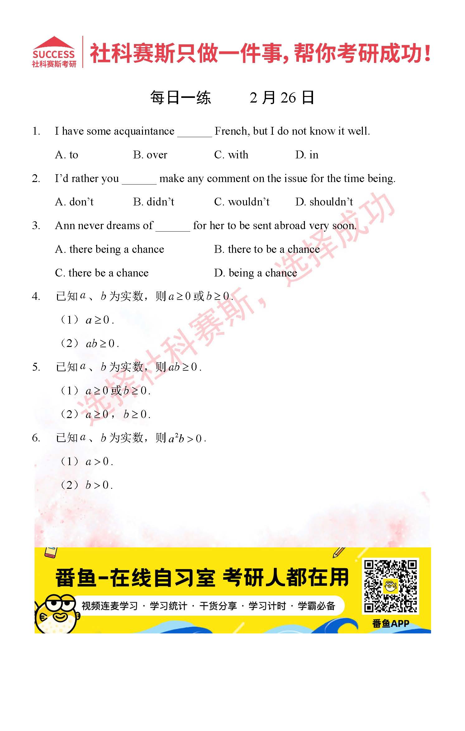 導讀:考研是一場持久戰(zhàn),保持良好的學習習慣,是能確保復(fù)習高效的關(guān)鍵。今天社科賽斯MBA備考網(wǎng)小編整理了“2022管理類聯(lián)2月26日每日一練及答案”的內(nèi)容,希望能對廣大考生有所幫助。