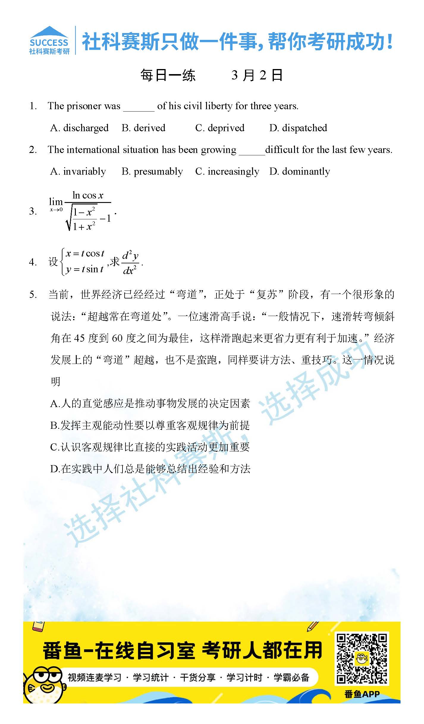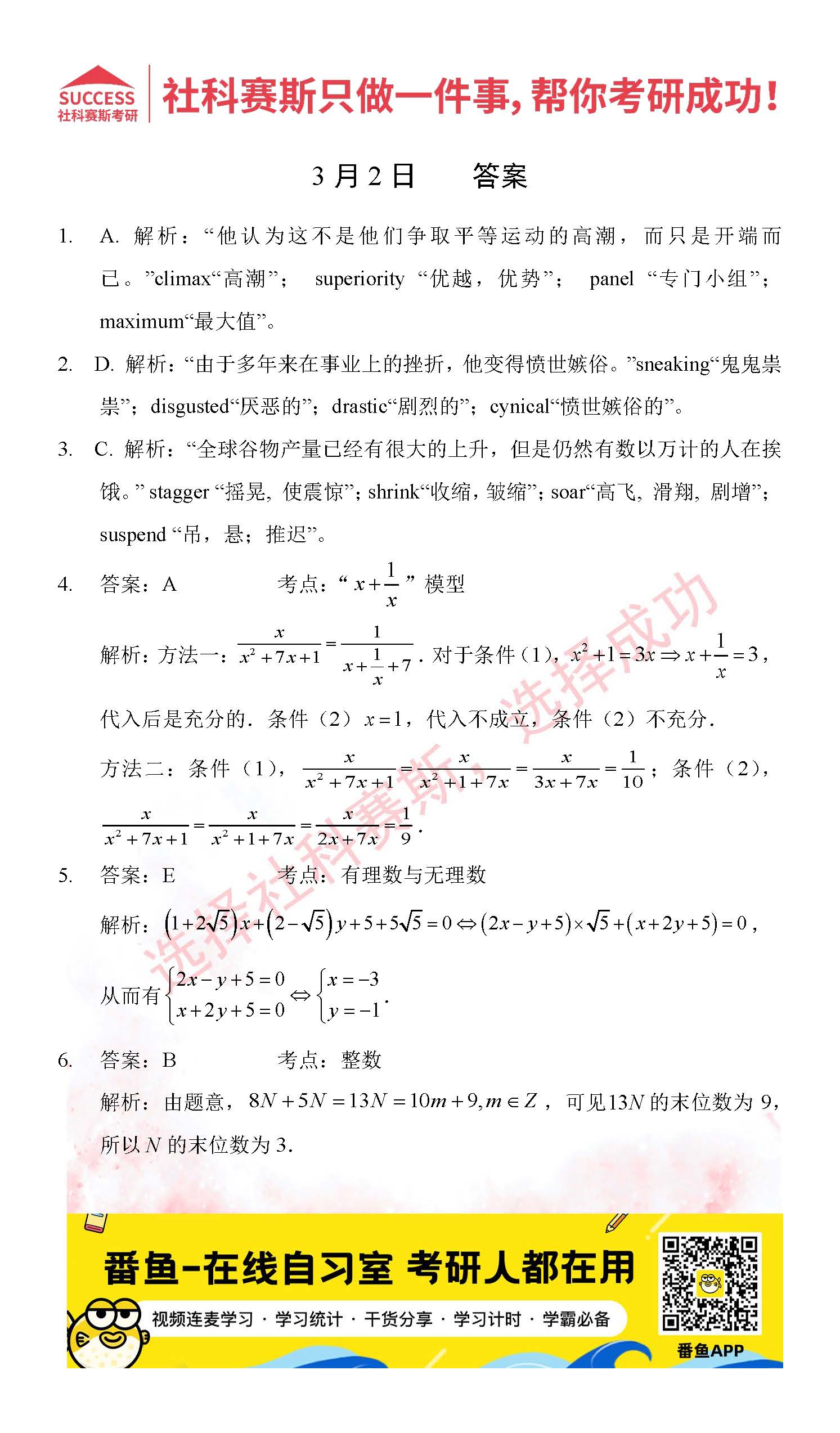 導(dǎo)讀:考研是一場(chǎng)持久戰(zhàn),保持良好的學(xué)習(xí)習(xí)慣,是能確保復(fù)習(xí)高效的關(guān)鍵。今天社科賽斯MBA備考網(wǎng)小編整理了“2022管理類聯(lián)3月2日每日一練及答案”的內(nèi)容,希望能對(duì)廣大考生有所幫助。