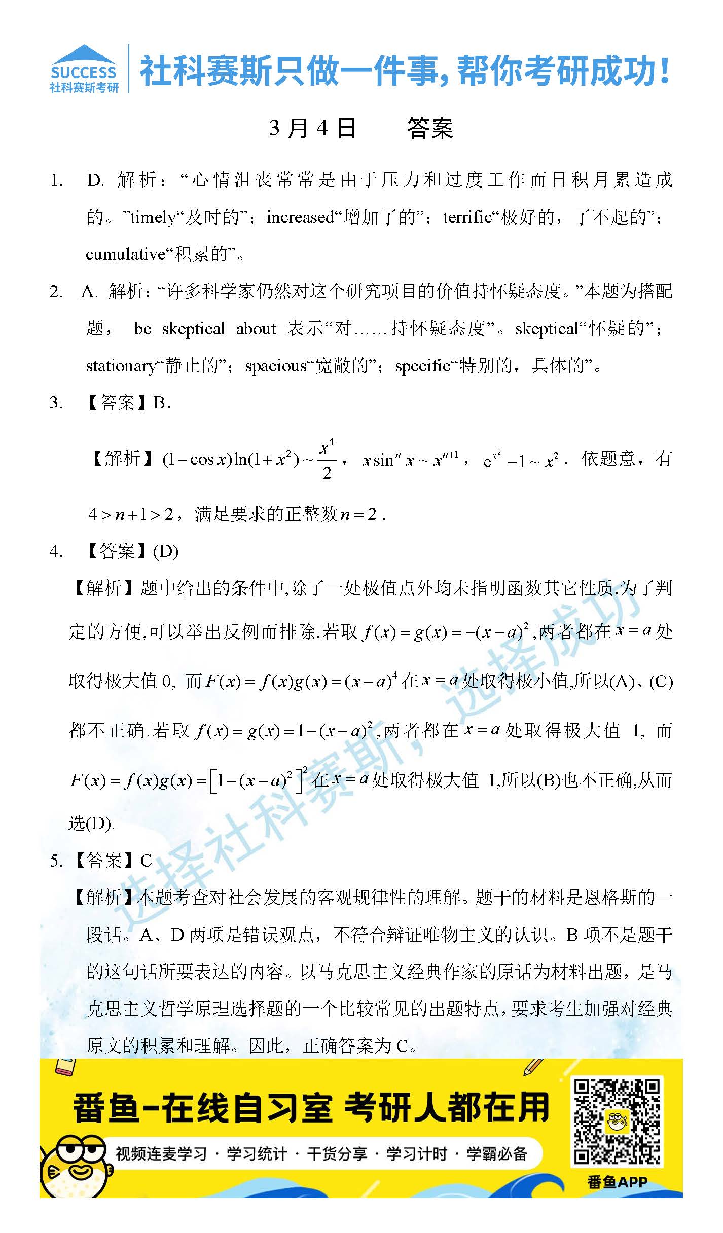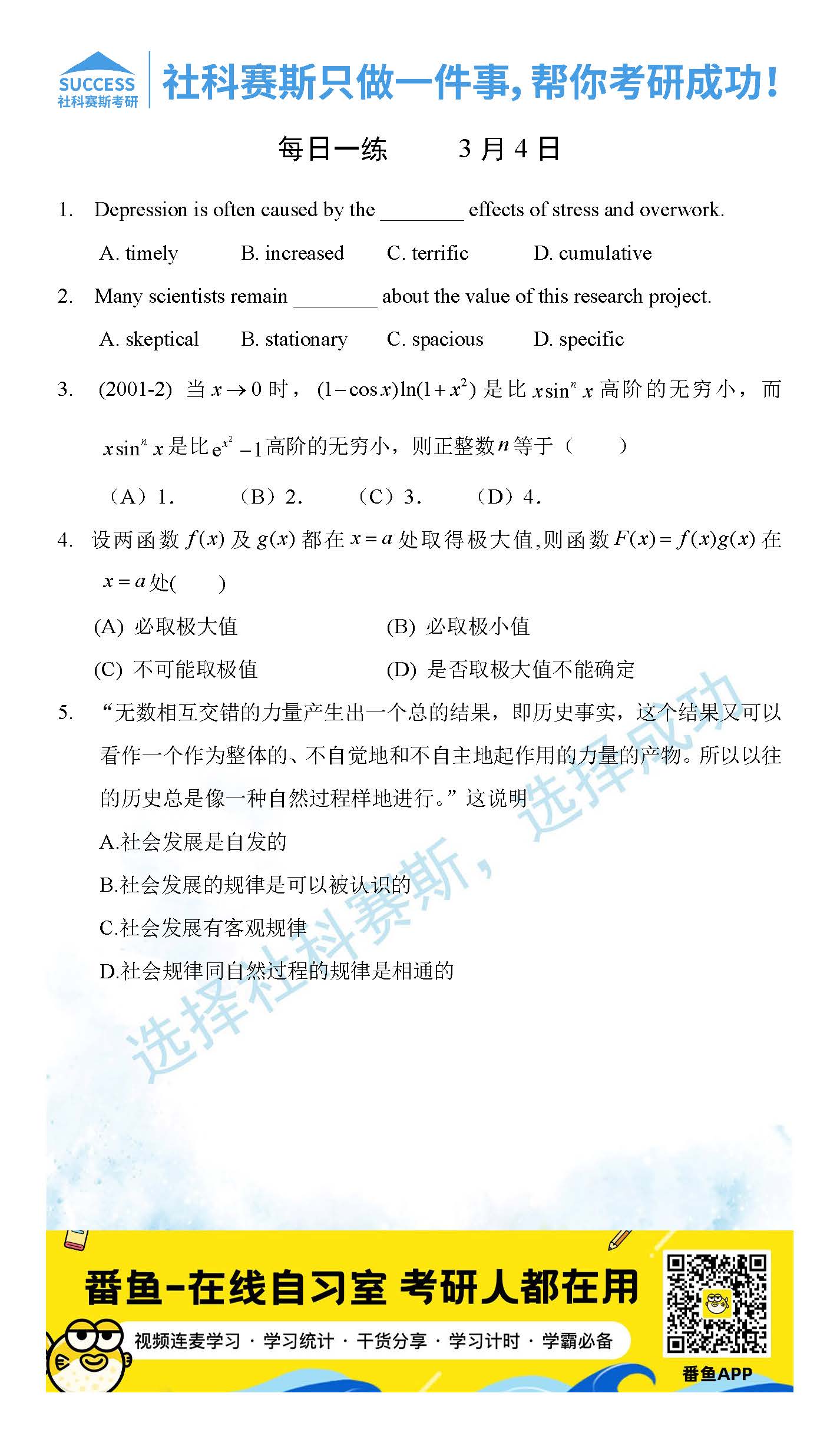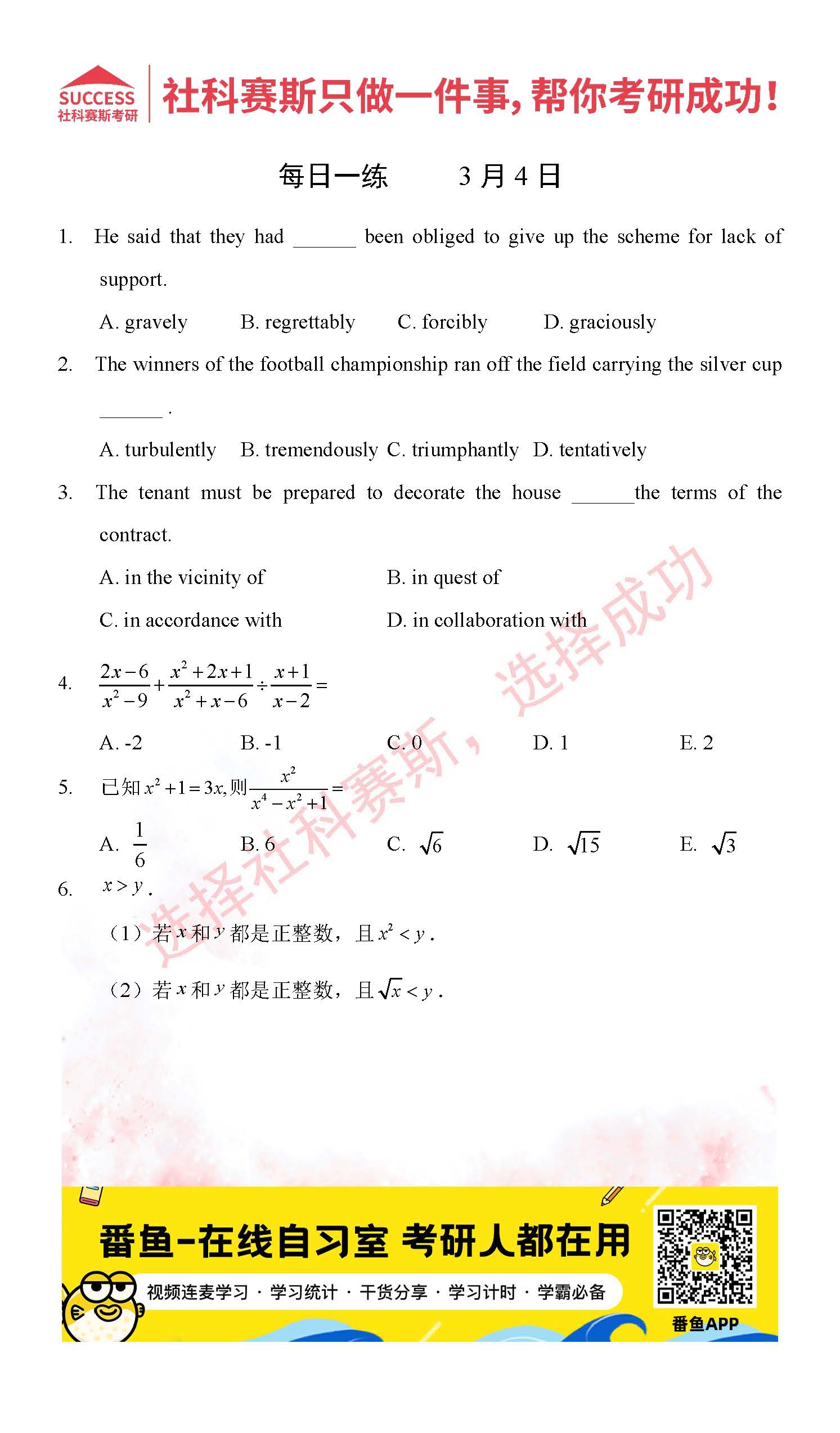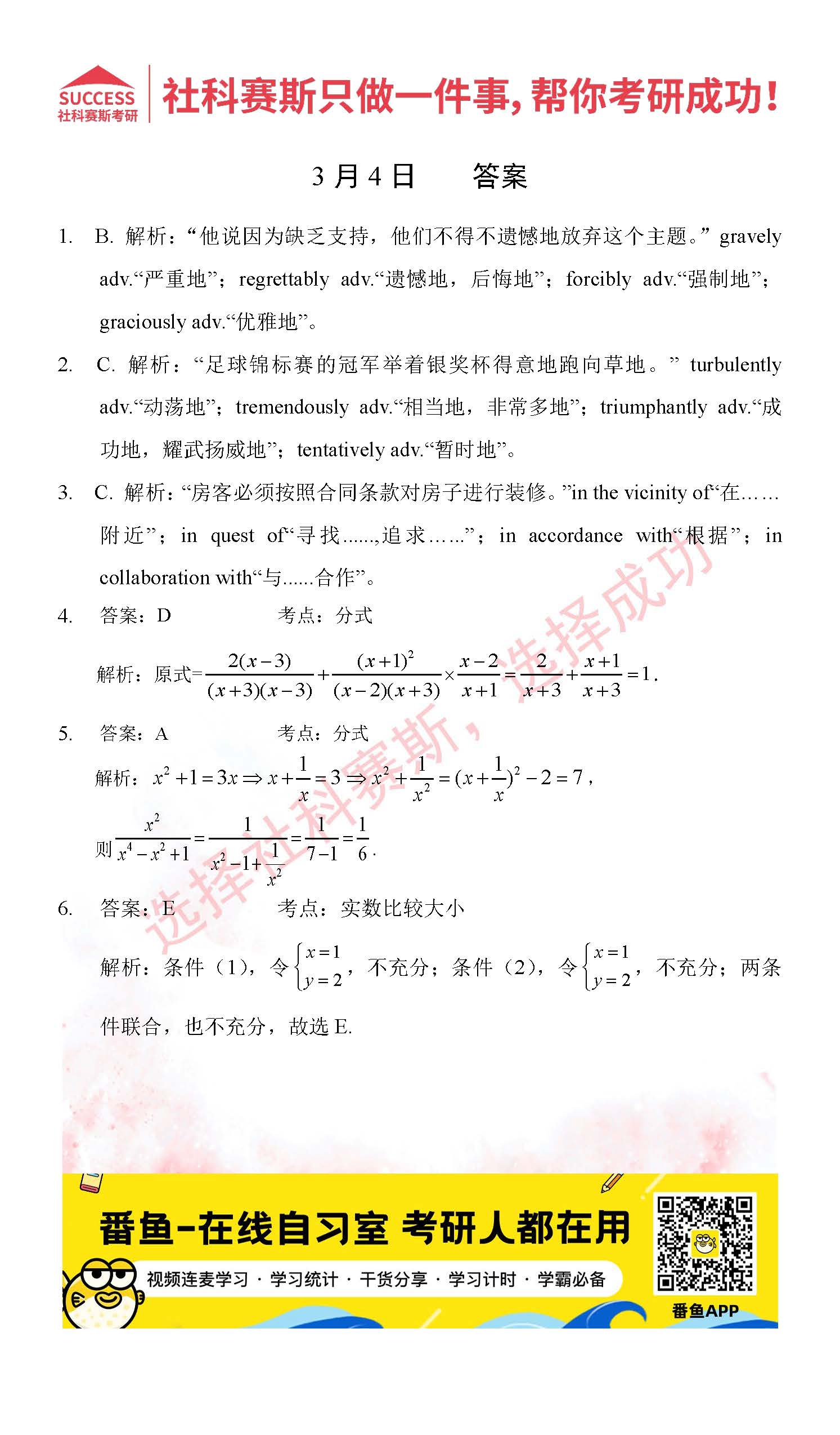 導(dǎo)讀:考研是一場(chǎng)持久戰(zhàn),保持良好的學(xué)習(xí)習(xí)慣,是能確保復(fù)習(xí)高效的關(guān)鍵。今天社科賽斯MBA備考網(wǎng)小編整理了“2022管理類聯(lián)3月4日每日一練及答案”的內(nèi)容,希望能對(duì)廣大考生有所幫助。