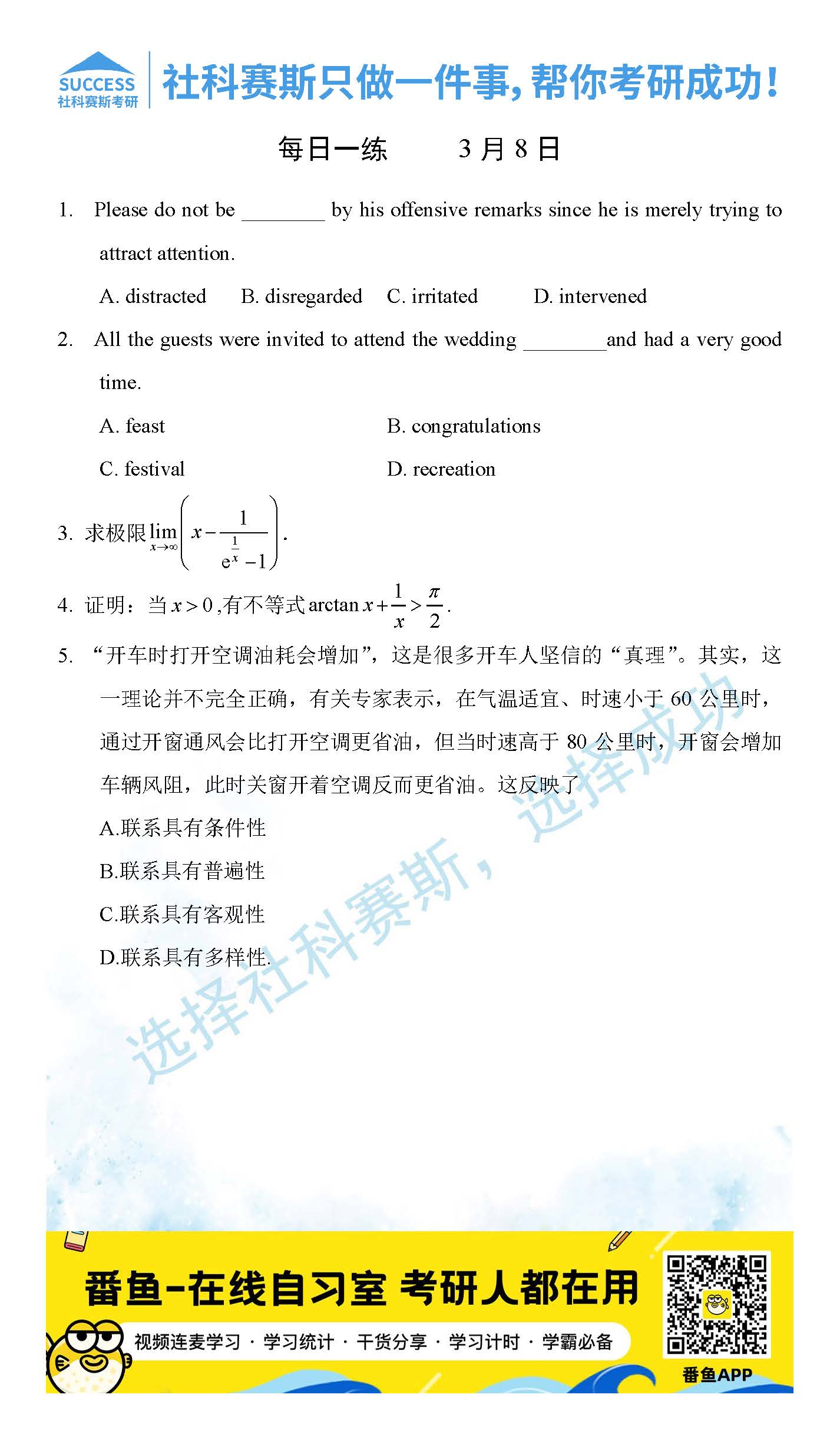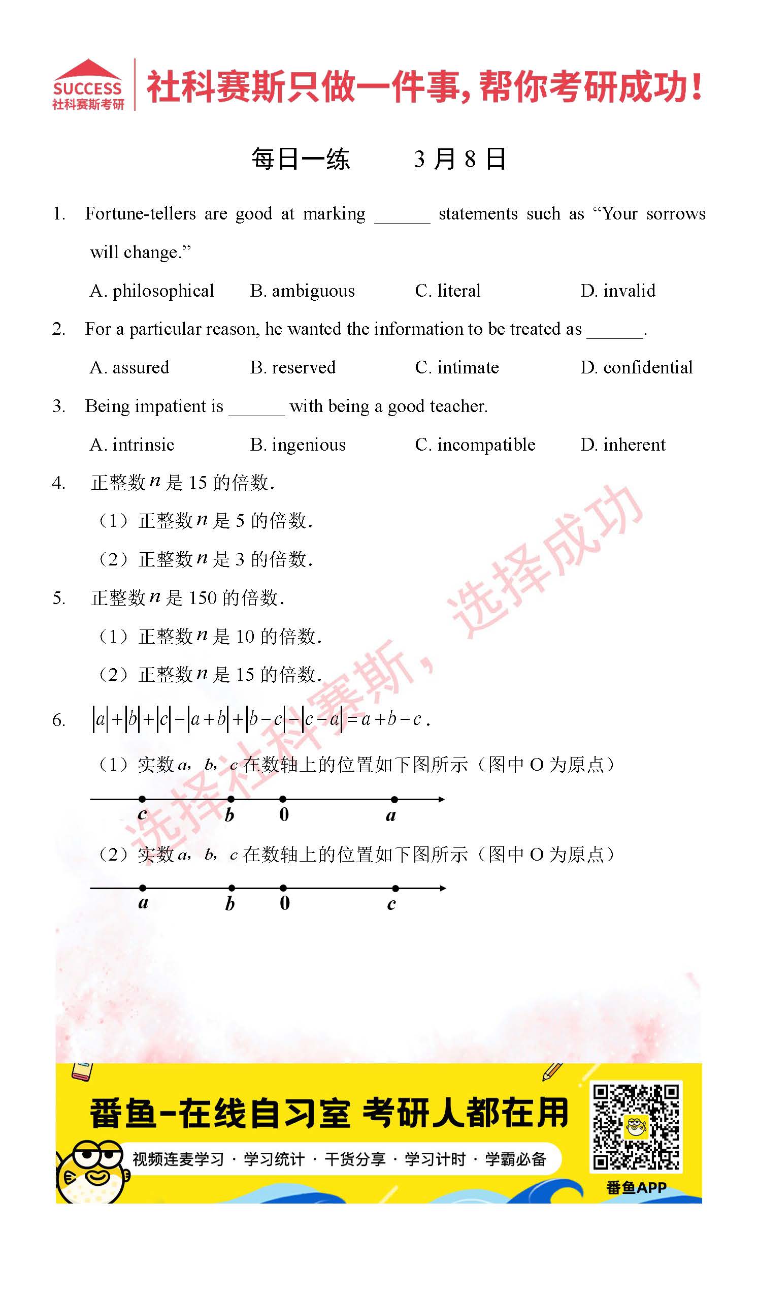 導(dǎo)讀:考研是一場(chǎng)持久戰(zhàn),保持良好的學(xué)習(xí)習(xí)慣,是能確保復(fù)習(xí)高效的關(guān)鍵。今天社科賽斯MBA備考網(wǎng)小編整理了“2022管理類(lèi)聯(lián)3月8日每日一練及答案”的內(nèi)容,希望能對(duì)廣大考生有所幫助。