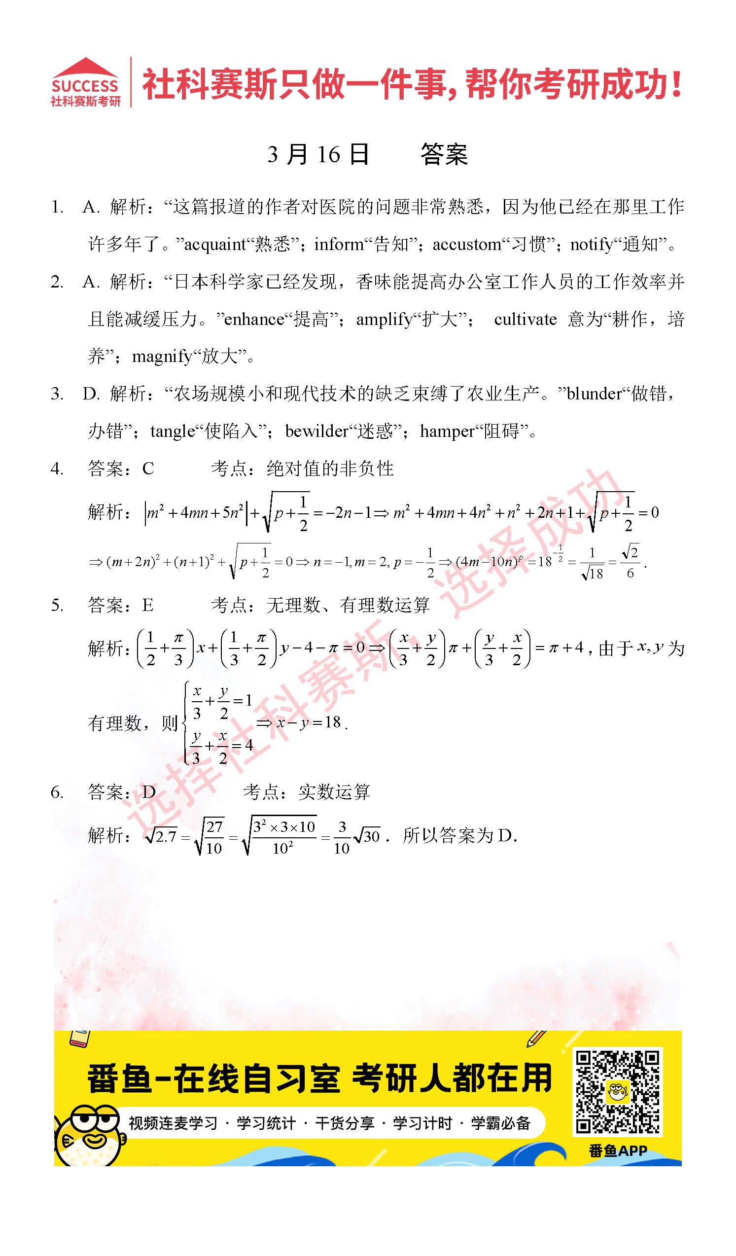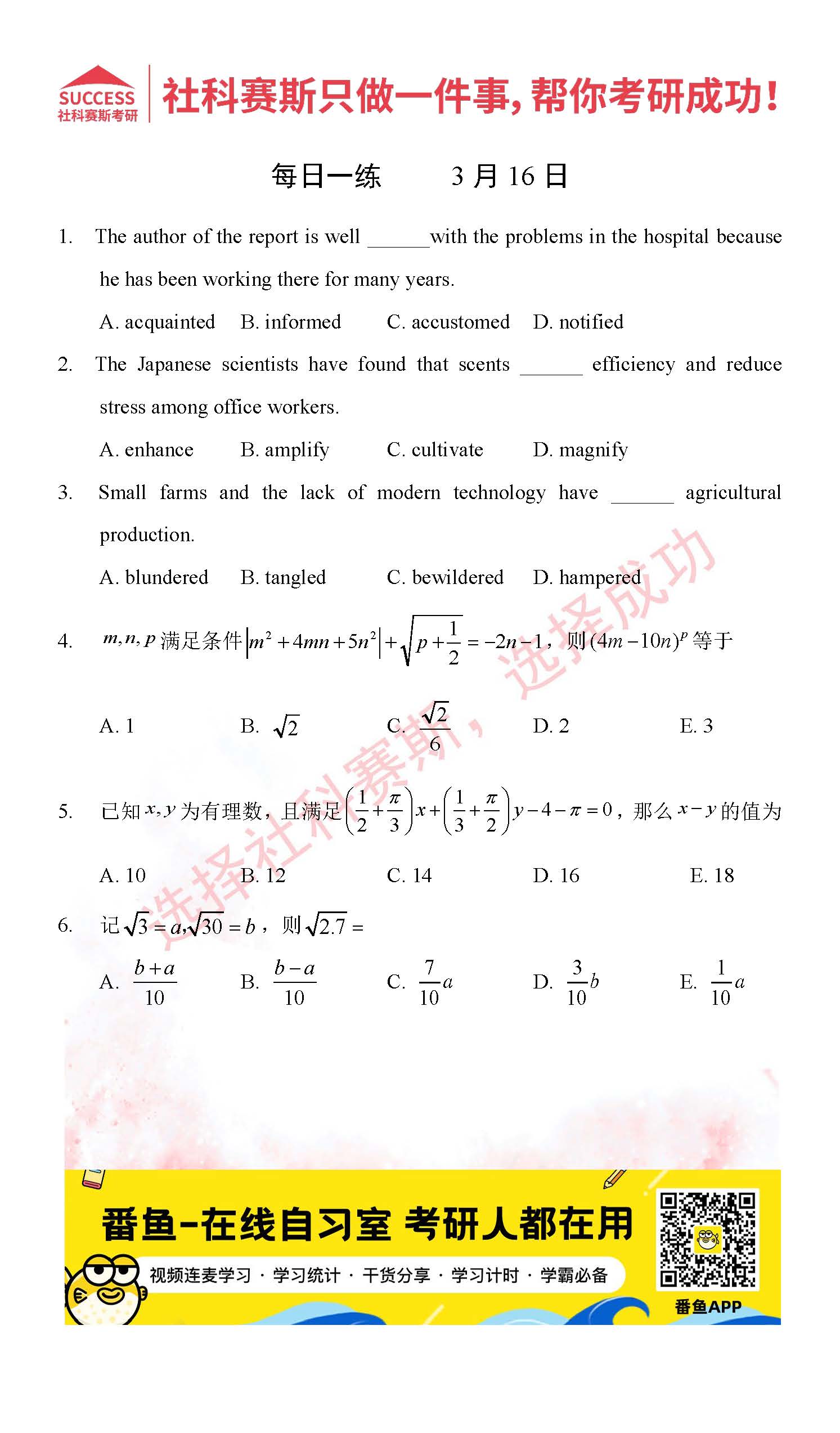 導(dǎo)讀:考研是一場持久戰(zhàn),保持良好的學(xué)習(xí)習(xí)慣,是能確保復(fù)習(xí)高效的關(guān)鍵。今天社科賽斯MBA備考網(wǎng)小編整理了“2022管理類聯(lián)3月16日每日一練及答案”的內(nèi)容,希望能對廣大考生有所幫助。