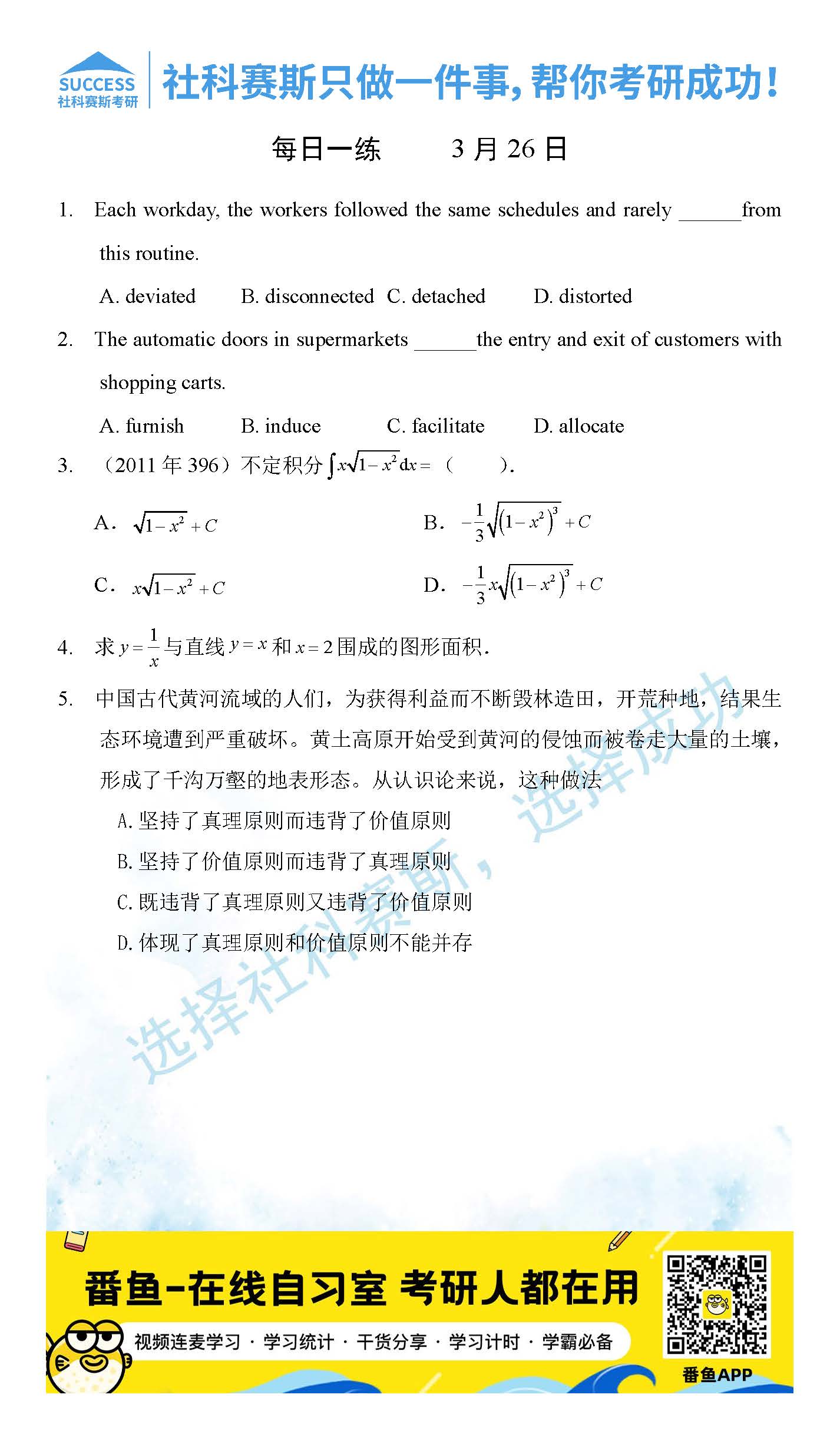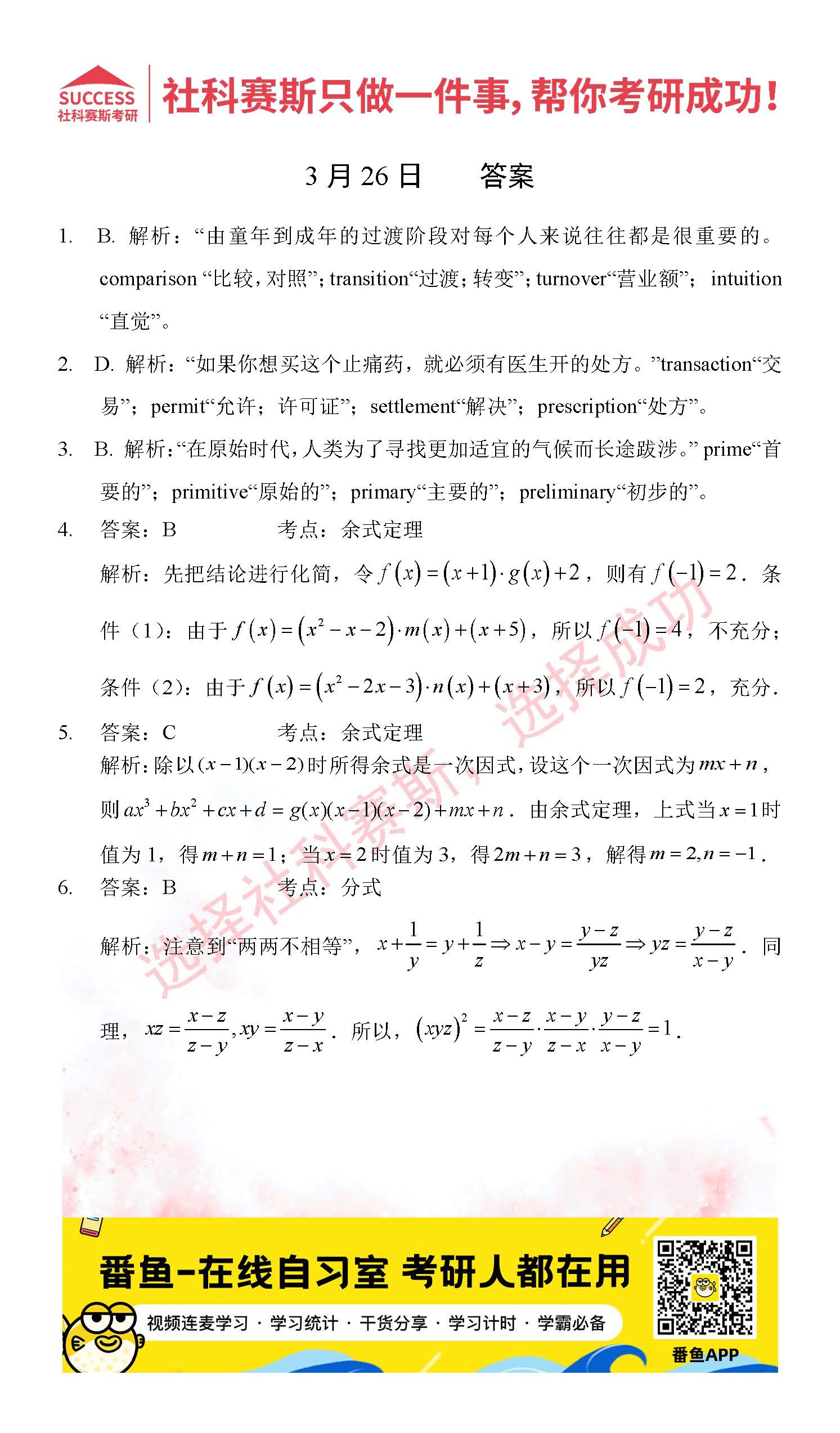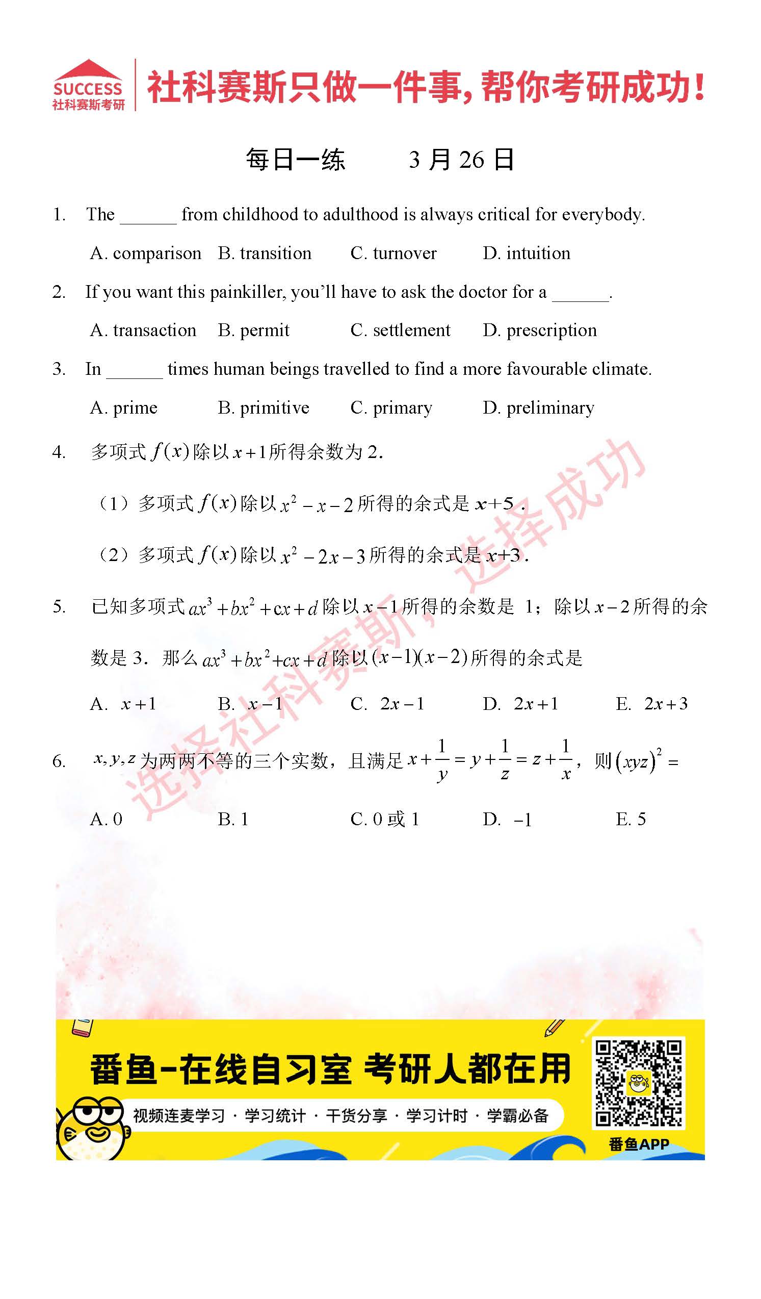 導讀:考研是一場持久戰,保持良好的學習習慣,是能確保復習高效的關鍵。今天社科賽斯MBA備考網小編整理了“2022管理類聯3月26日每日一練及答案”的內容,希望能對廣大考生有所幫助。