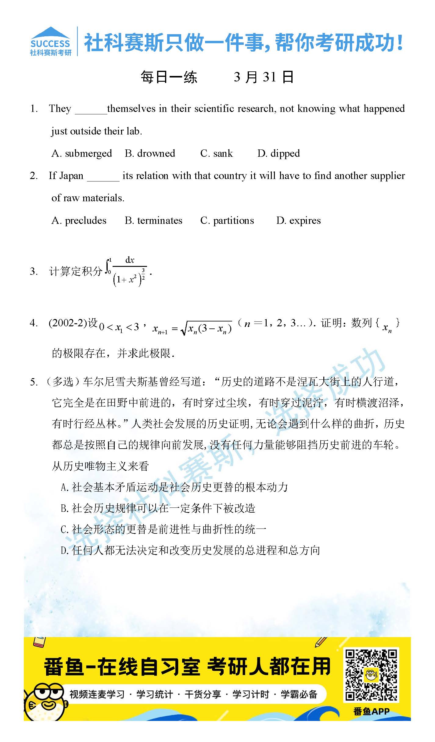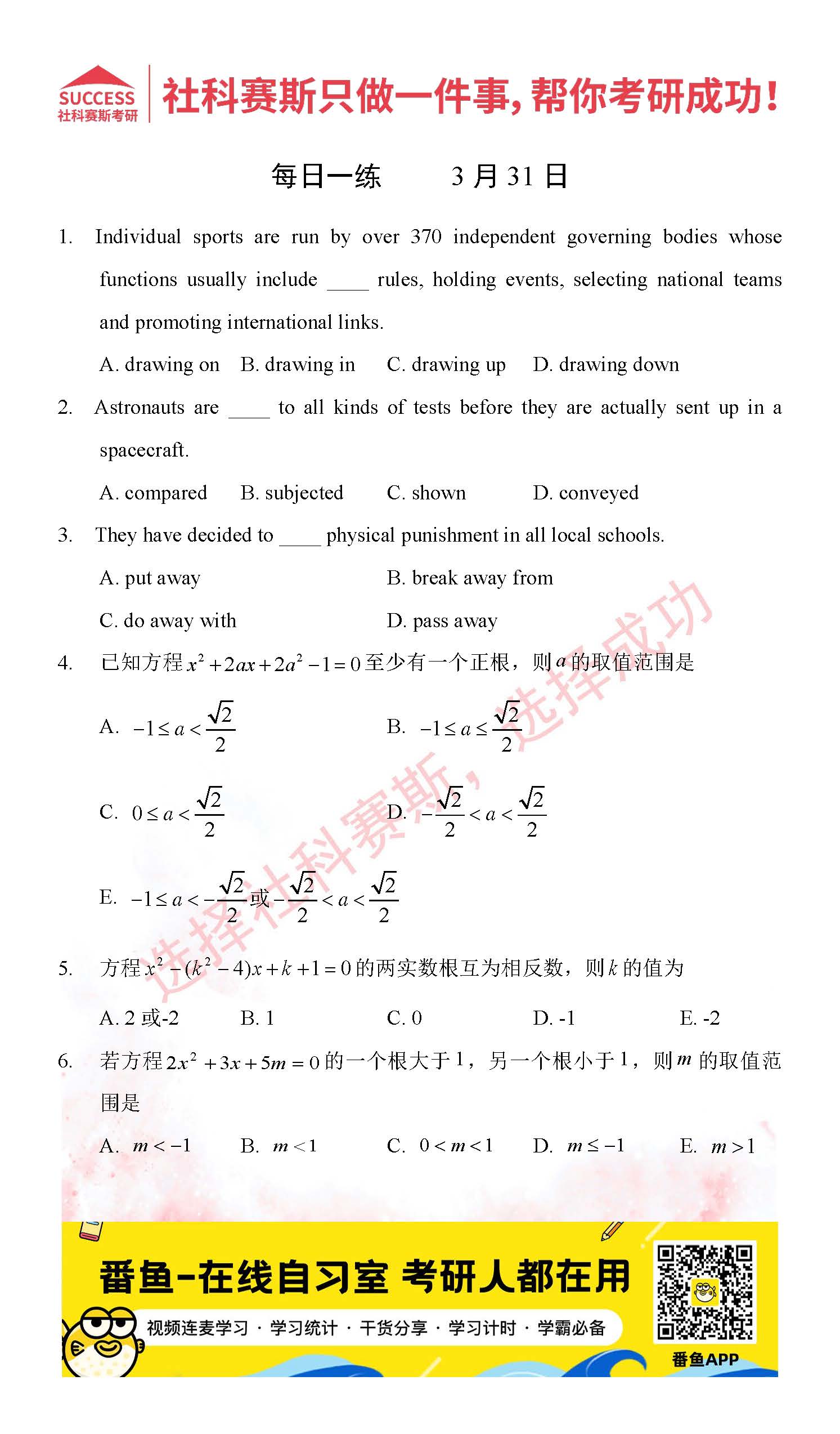 導(dǎo)讀:考研是一場(chǎng)持久戰(zhàn),保持良好的學(xué)習(xí)習(xí)慣,是能確保復(fù)習(xí)高效的關(guān)鍵。今天社科賽斯MBA備考網(wǎng)小編整理了“2022管理類聯(lián)3月31日每日一練及答案”的內(nèi)容,希望能對(duì)廣大考生有所幫助。