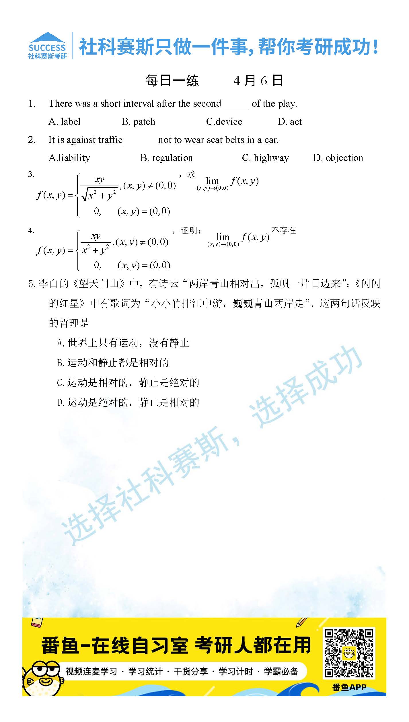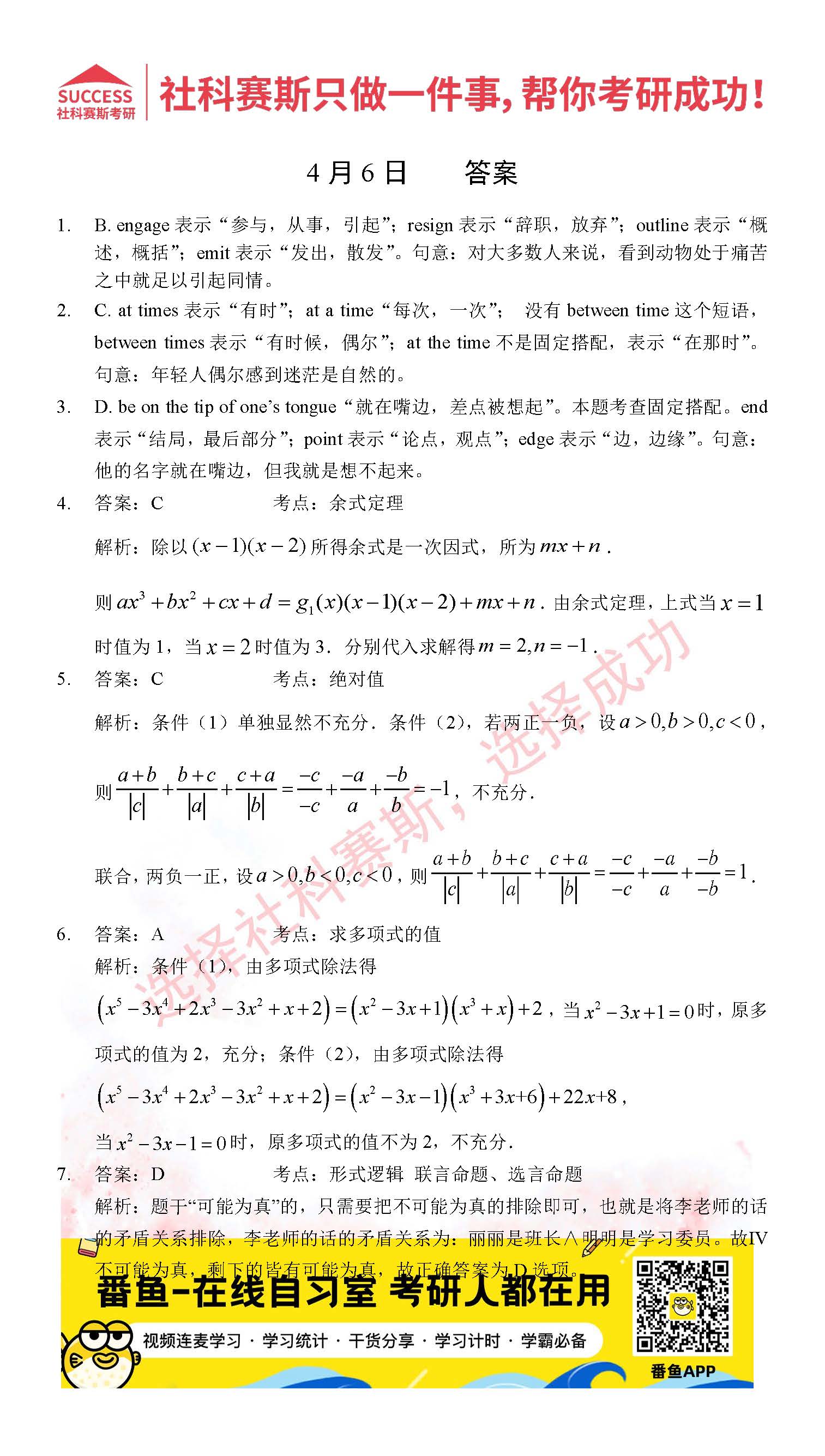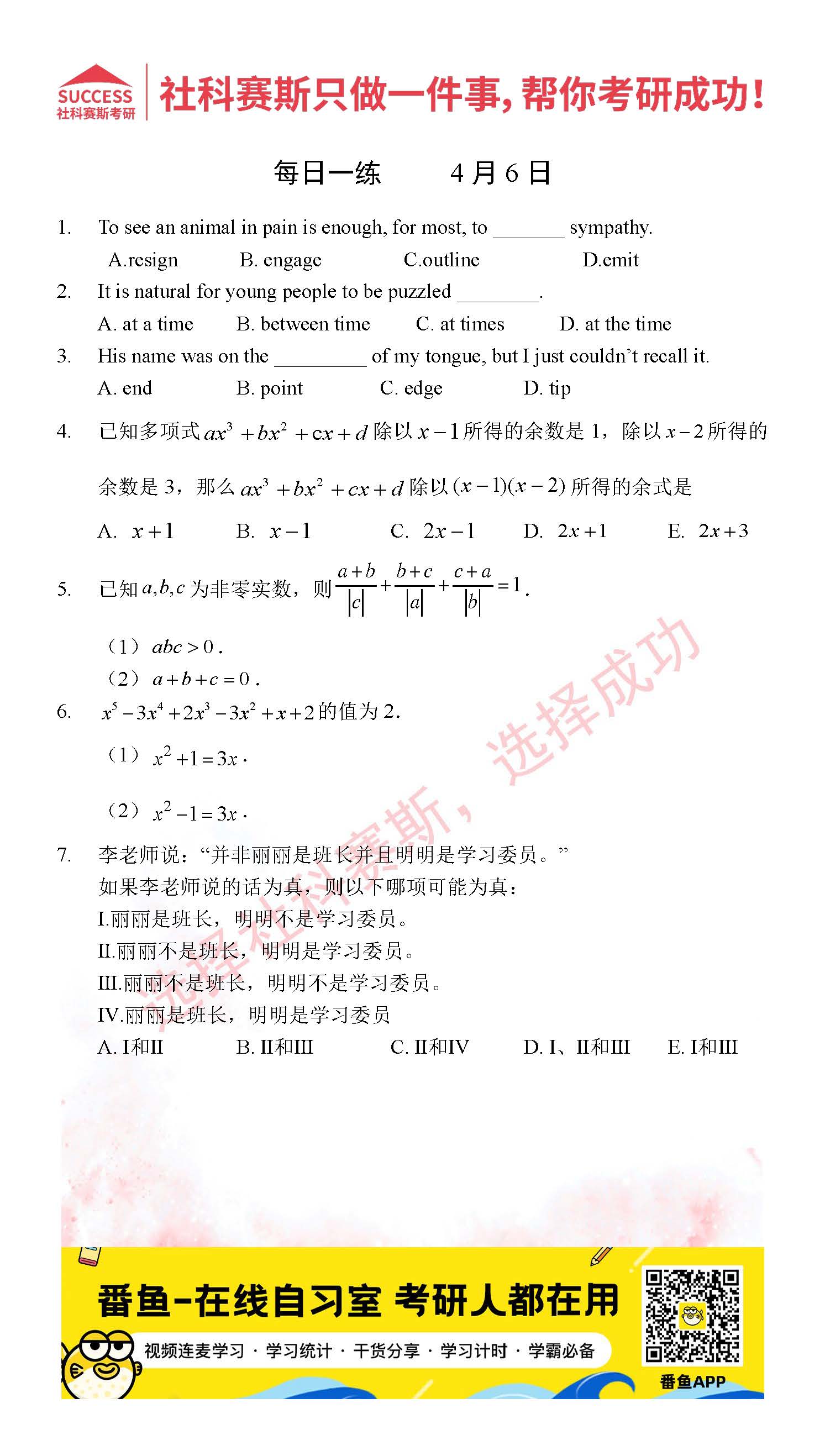 導(dǎo)讀:考研是一場(chǎng)持久戰(zhàn),保持良好的學(xué)習(xí)習(xí)慣,是能確保復(fù)習(xí)高效的關(guān)鍵。今天社科賽斯MBA備考網(wǎng)小編整理了“2022管理類聯(lián)考4月6日每日一練及答案”的內(nèi)容,希望能對(duì)廣大考生有所幫助。
