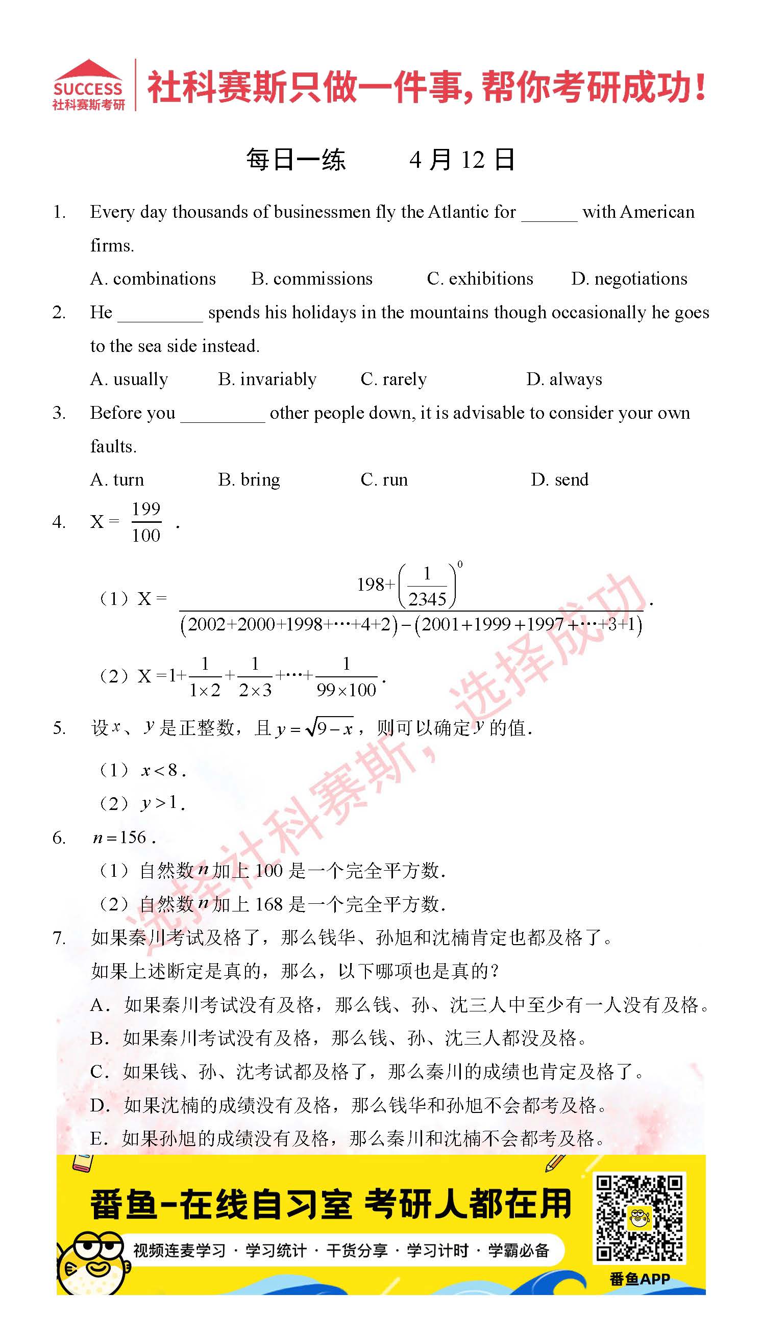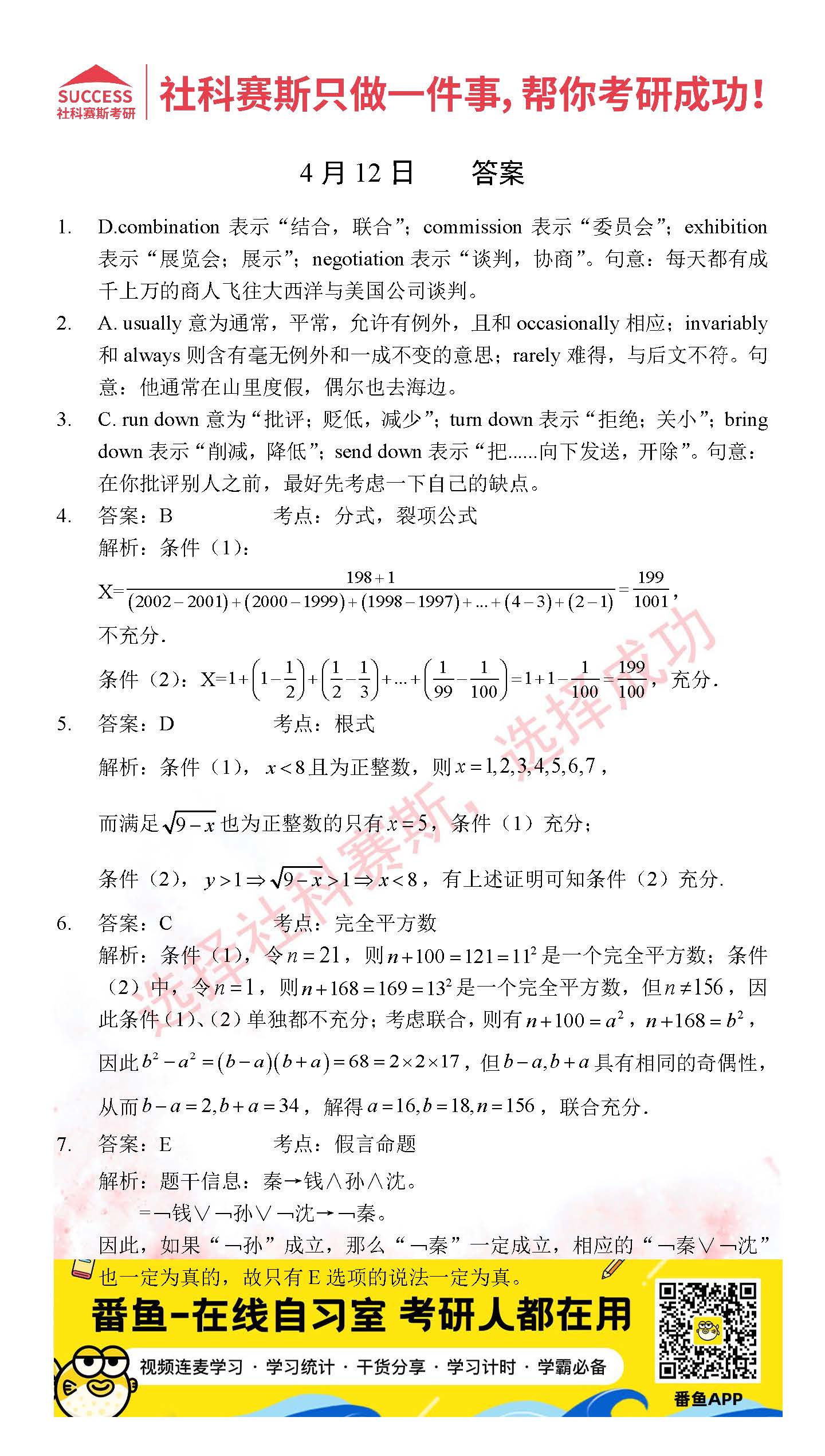 導讀:考研是一場持久戰,保持良好的學習習慣,是能確保復習高效的關鍵。今天社科賽斯MBA備考網小編整理了“2022管理類聯考4月12日每日一練及答案”的內容,希望能對廣大考生有所幫助。