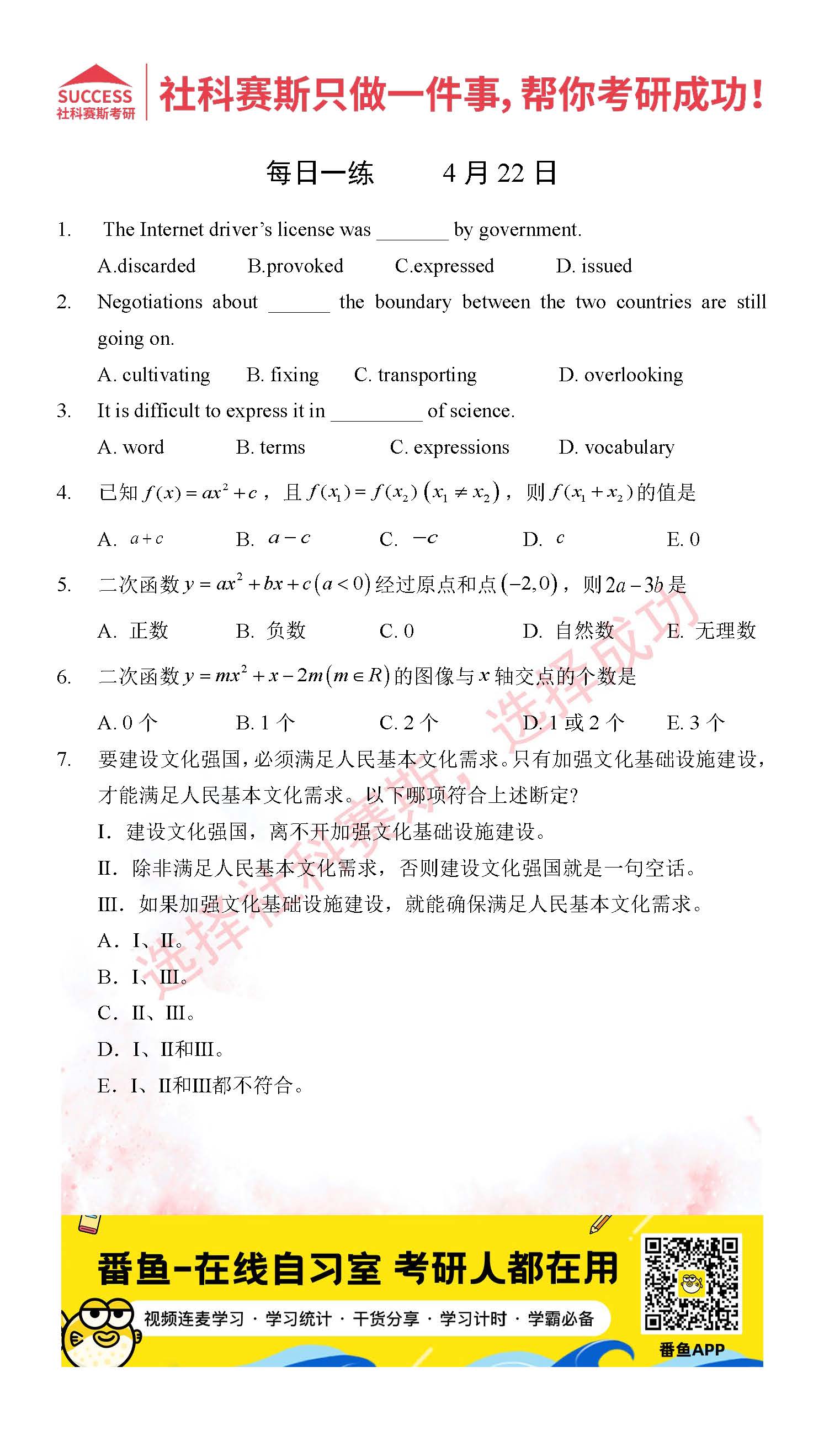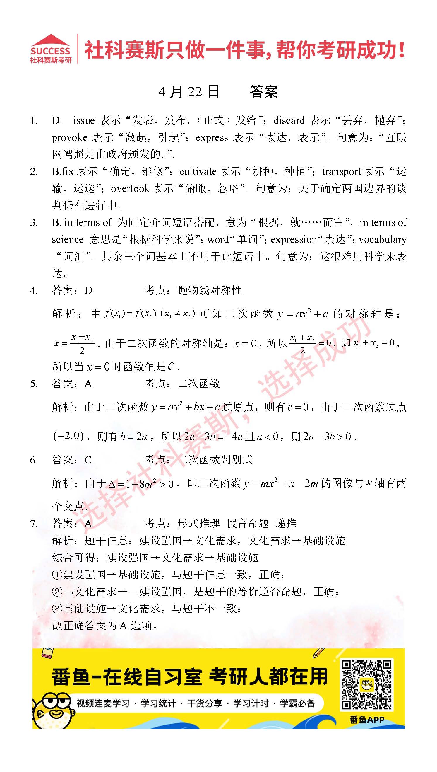 以上就是社科賽斯MBA備考網小編為大家整理2022管理類聯考4月22日每日一練及答案的全部內容,希望各位考生堅持利用起來,更多每日一練內容請持續關注MBA備考網管理類聯考每日一練。