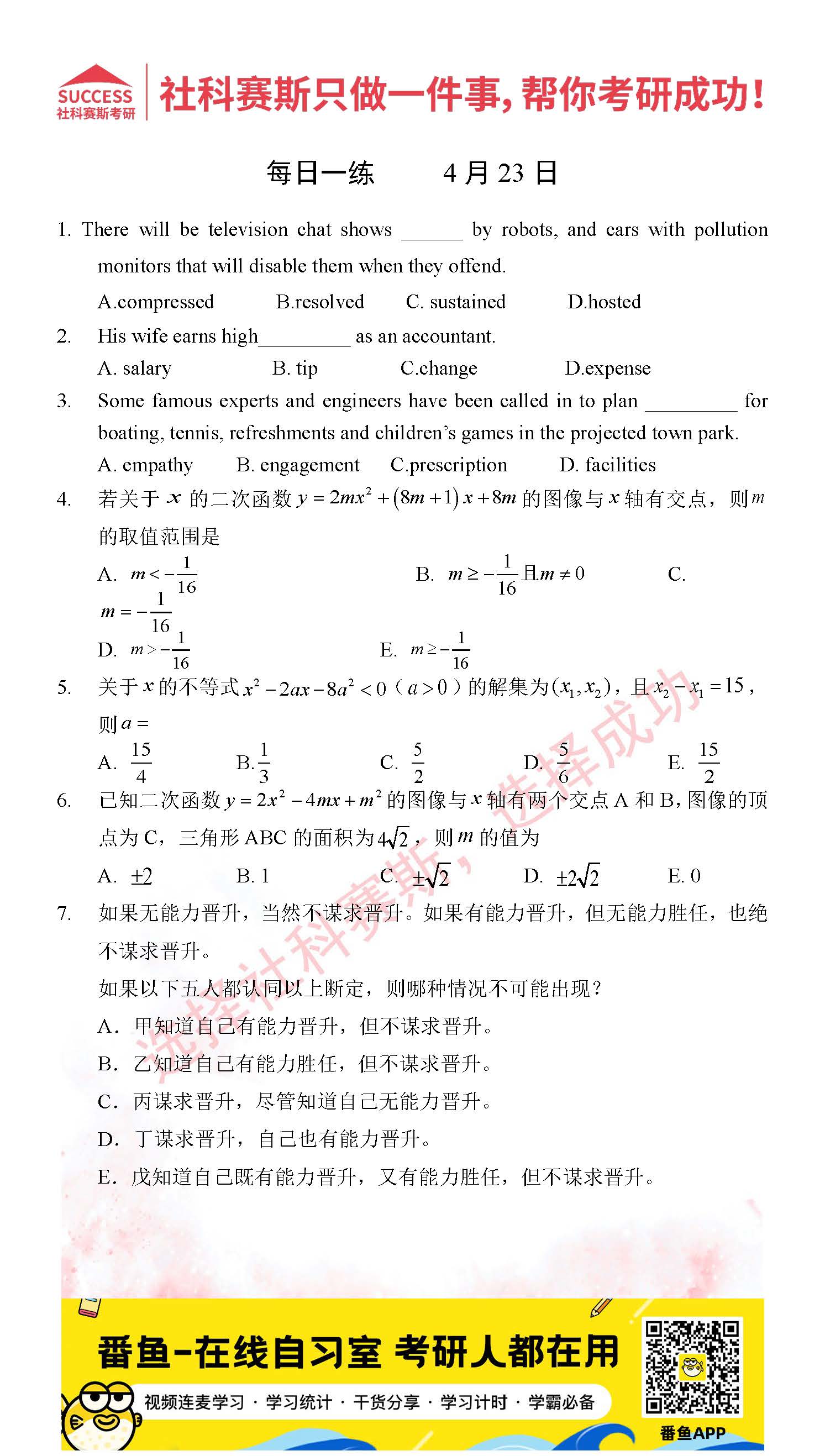 導讀:考研是一場持久戰,保持良好的學習習慣,是能確保復習高效的關鍵。今天社科賽斯MBA備考網小編整理了“2022管理類聯考4月23日每日一練及答案”的內容,希望能對廣大考生有所幫助。