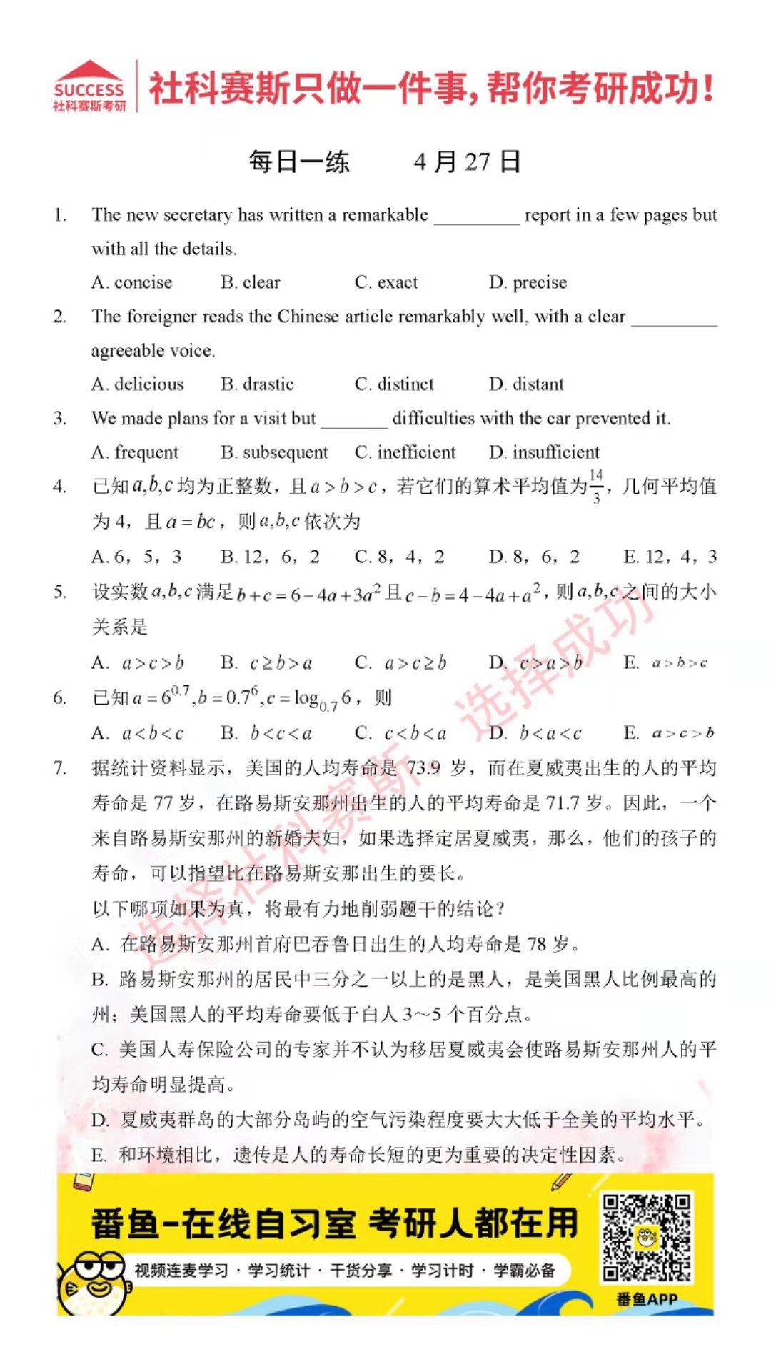 導讀:考研是一場持久戰,保持良好的學習習慣,是能確保復習高效的關鍵。今天社科賽斯MBA備考網小編整理了“2022管理類聯考4月27日每日一練及答案”的內容,希望能對廣大考生有所幫助。
