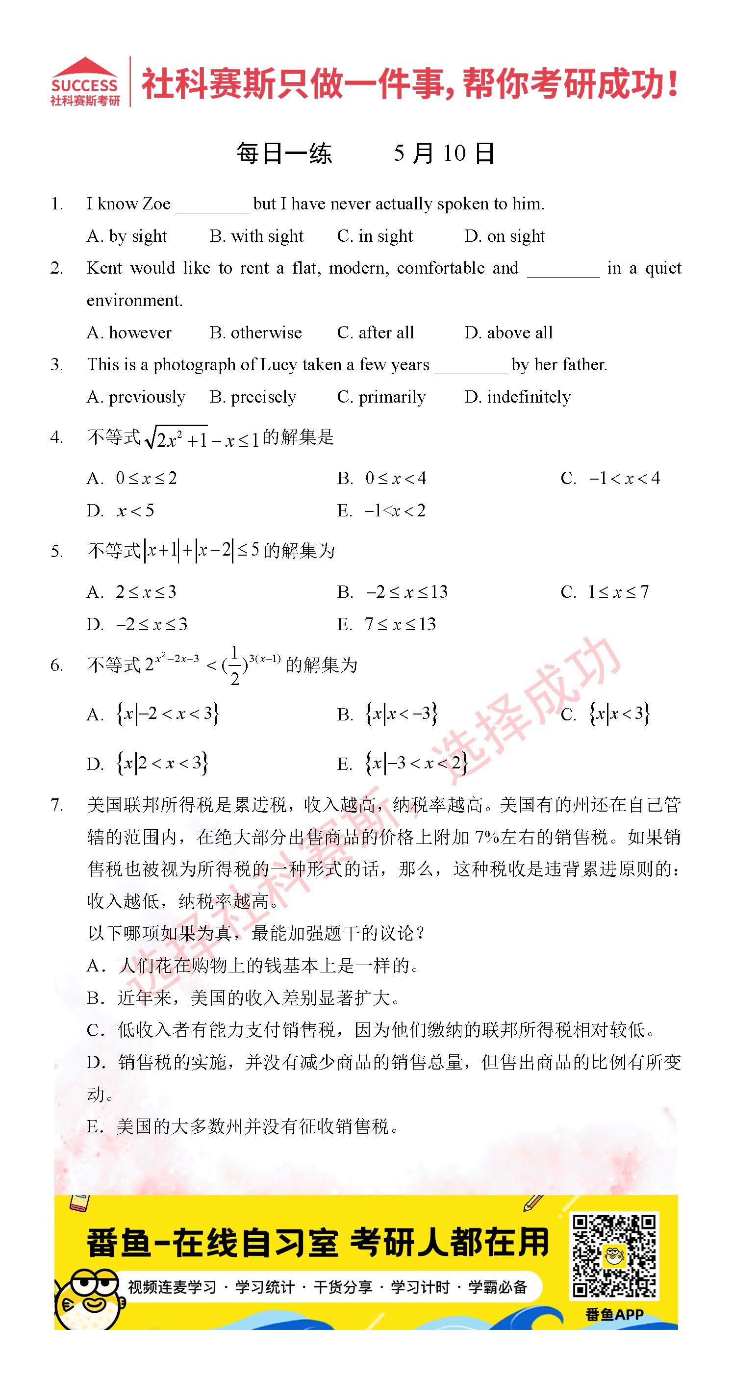 以上就是社科賽斯MBA備考網小編為大家整理2022管理類聯考5月10日每日一練及答案的全部內容,希望各位考生堅持利用起來,更多每日一練內容請持續關注MBA備考網管理類聯考每日一練。