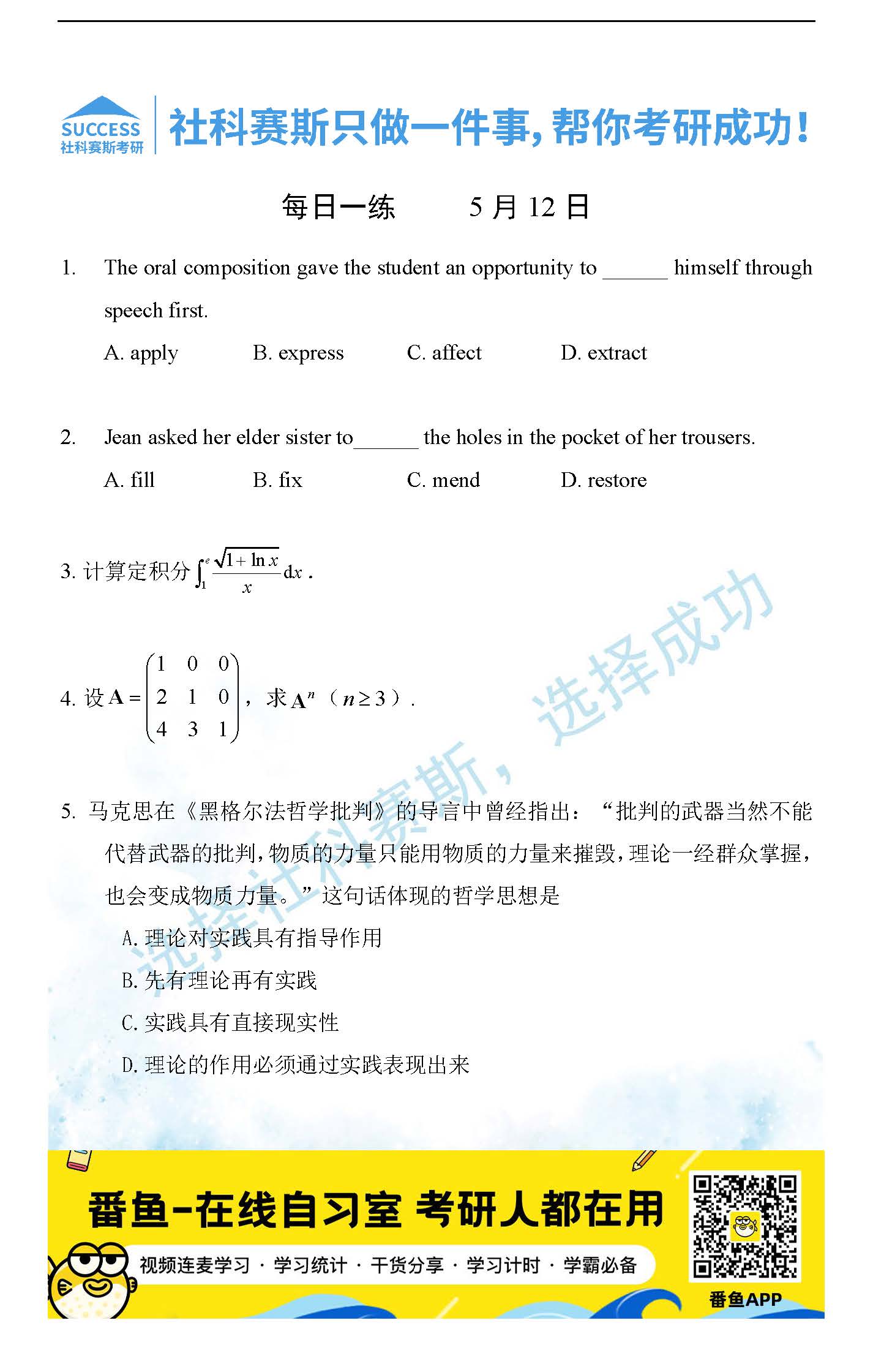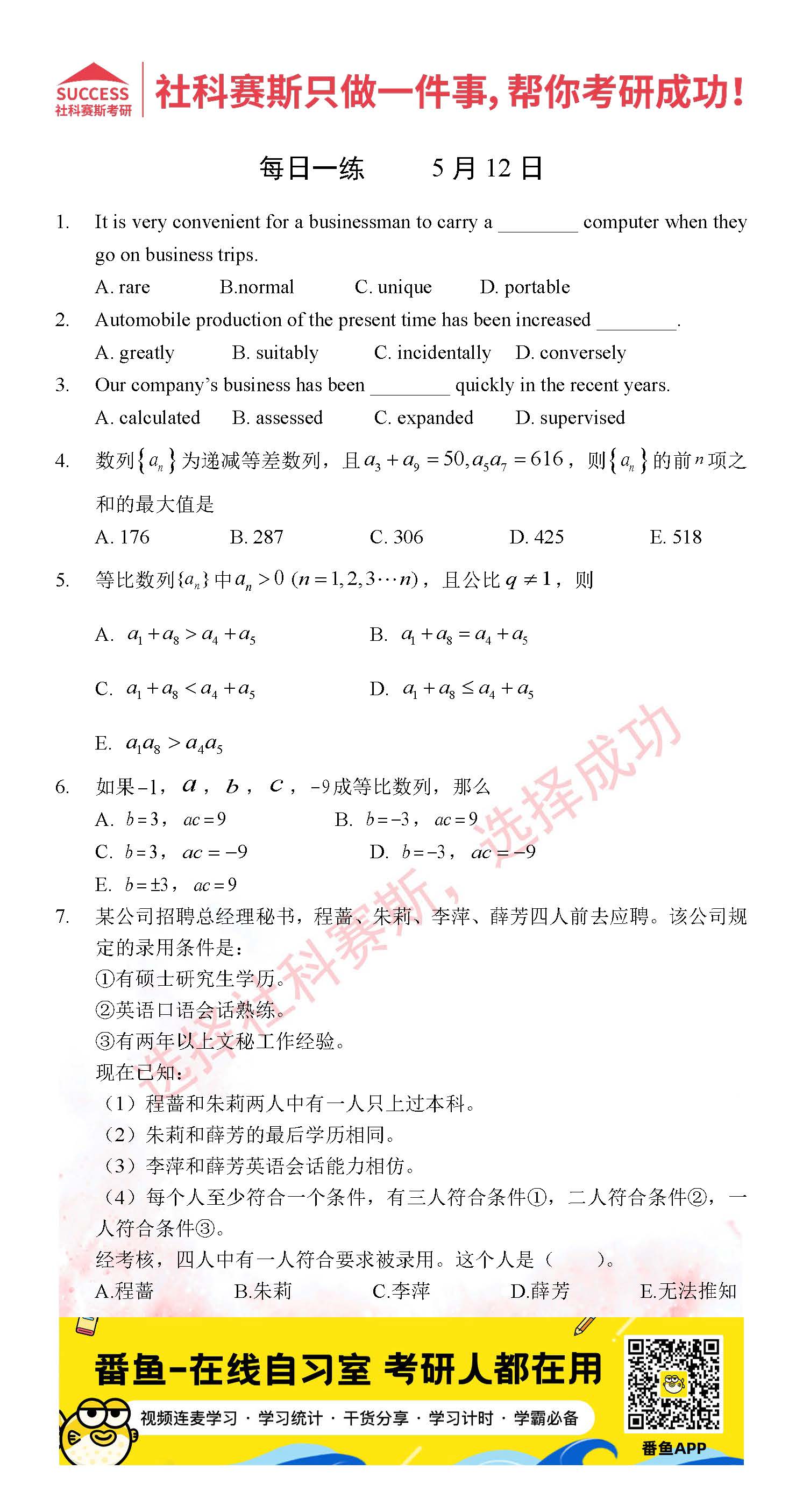 導讀:考研是一場持久戰,保持良好的學習習慣,是能確保復習高效的關鍵。今天社科賽斯MBA備考網小編整理了“2022管理類聯考5月12日每日一練及答案”的內容,希望能對廣大考生有所幫助。