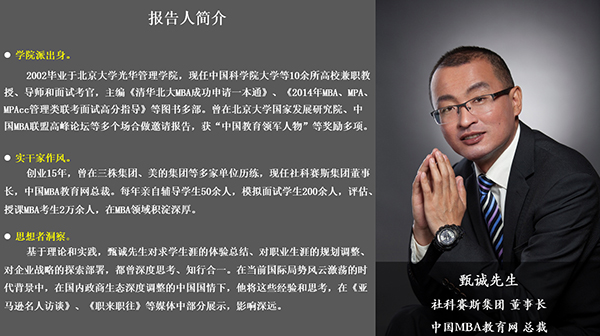 隨后,甄誠(chéng)先生從“如何認(rèn)識(shí)及利用‘講座’”、“解析當(dāng)代高校學(xué)生特點(diǎn)”、“高校生職業(yè)規(guī)劃”、“如何保持好習(xí)慣”、“如何拓展人脈”、“如何做好組織者”、“如何獲得精彩人生”幾個(gè)方面出發(fā),結(jié)合自身多年經(jīng)驗(yàn)、指導(dǎo)MBA面試實(shí)戰(zhàn)經(jīng)驗(yàn),為大家?guī)?lái)了分量十足的職場(chǎng)干貨,以幽默風(fēng)趣、真實(shí)有用接地氣的言論博得了在場(chǎng)人員的陣陣掌聲。甄誠(chéng)先生在談及開設(shè)高校講座的意義時(shí),語(yǔ)重心長(zhǎng)的指出“機(jī)會(huì)是自己爭(zhēng)取的,不是別人給予的”,并以成功考取清華大學(xué)經(jīng)管學(xué)院的社科賽斯學(xué)員在千人之中脫穎而出獲得和前美國(guó)國(guó)務(wù)卿賴斯交談的機(jī)會(huì)為例,鼓勵(lì)大家要做足準(zhǔn)備,認(rèn)真對(duì)待眼前的每一次機(jī)會(huì),做好人生的規(guī)劃。