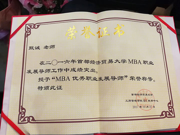 導(dǎo)讀:2017年10月27日下午,首都經(jīng)濟(jì)貿(mào)易大學(xué)對(duì)甄董在2016年MBA職業(yè)發(fā)展導(dǎo)師的工作表示肯定,甄誠(chéng)董事長(zhǎng)被授予首經(jīng)貿(mào)“MBA優(yōu)秀職業(yè)發(fā)展導(dǎo)師”榮譽(yù)稱號(hào)。