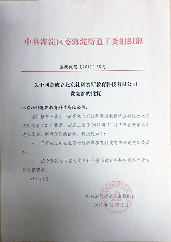 關(guān)于同意成立北京社科賽斯黨支部的批復(fù)