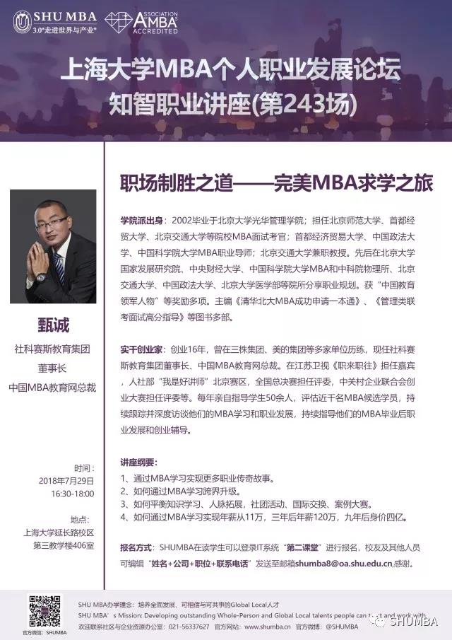 07月29日(周日),我們將迎來SHUMBA個人職業發展論壇知智職業講座(第243場)——職場制勝之道 | 完美MBA求學之旅。