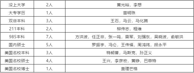 知名自媒體人何加鹽曾經(jīng)做過一項統(tǒng)計,分析了28名企業(yè)家和學(xué)歷之間的關(guān)系。