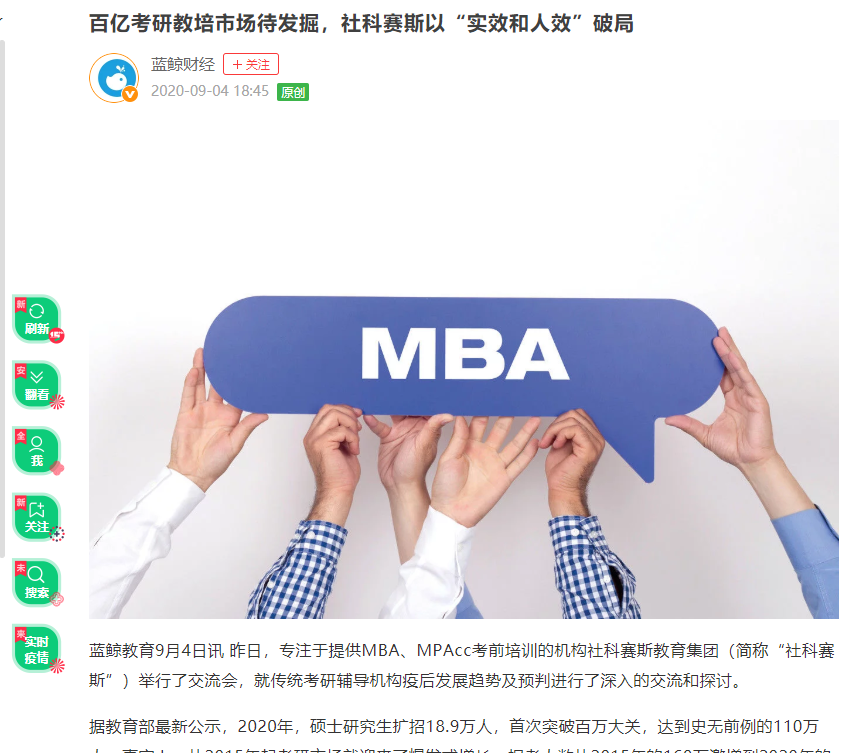 以上就是“藍鯨財經 | 百億考研教培市場待發掘,社科賽斯以“實效和人效”破局”的全部內容了,更多資訊,請持續關注MBA備考網!