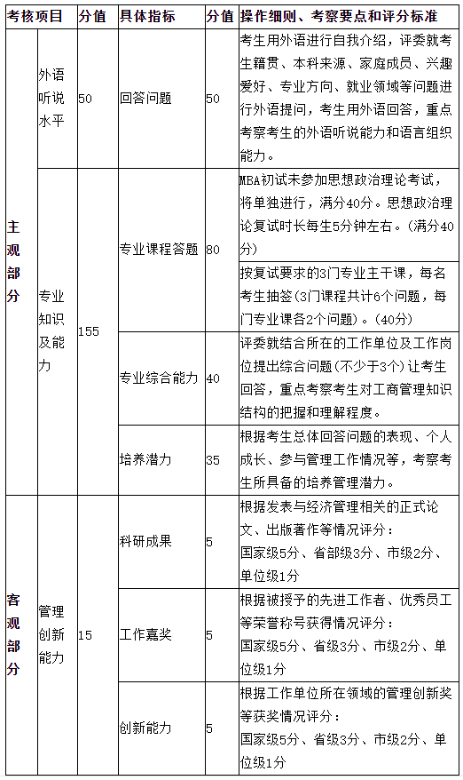 復試環節包括政治理論測試、外語水平測試、專業知識及能力測試與管理創新能力測試,每人時間20分鐘左右。具體標準與流程見表1。