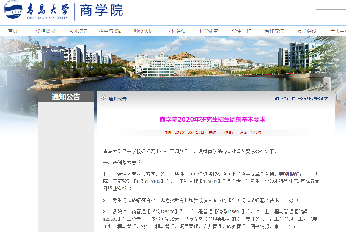 青島大學已在學校研招網上公布了調劑公告,現就商學院各專業調劑要求公布如下: