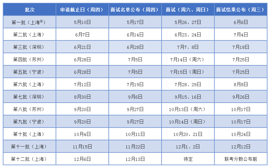 4.第一批至第九批申請人請務必選擇與就讀地點相對應的面試批次,且面試后直至入學,不得更改就讀地點;蘇州、寧波、深圳教學點僅開設綜合MBA項目;