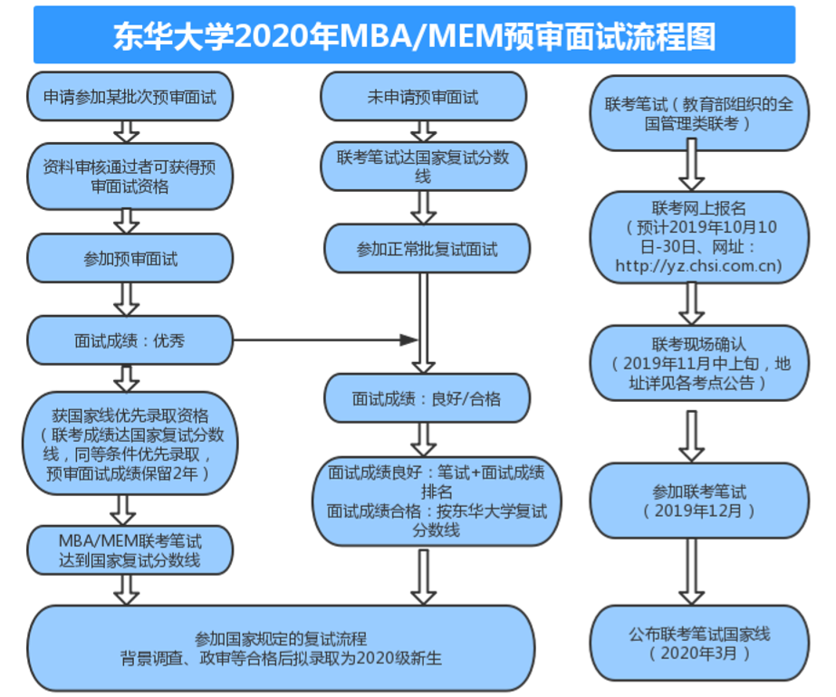 三、東華大學2020年MBA/MEM具體報名及預審面試時間安排如下: