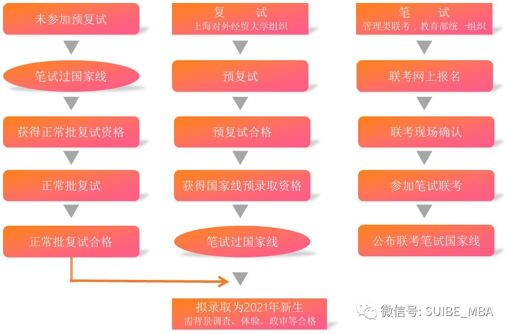 ?參加預(yù)復(fù)試并通過的考生,報(bào)考上海對(duì)外經(jīng)貿(mào)大學(xué)MBA項(xiàng)目,在全國(guó)管理類聯(lián)考成績(jī)達(dá)到國(guó)家復(fù)試分?jǐn)?shù)線(例如2019年:總分≥170分,綜合≥84,英語≥42分),并完成國(guó)家規(guī)定的復(fù)試流程后同等條件下優(yōu)先錄取。