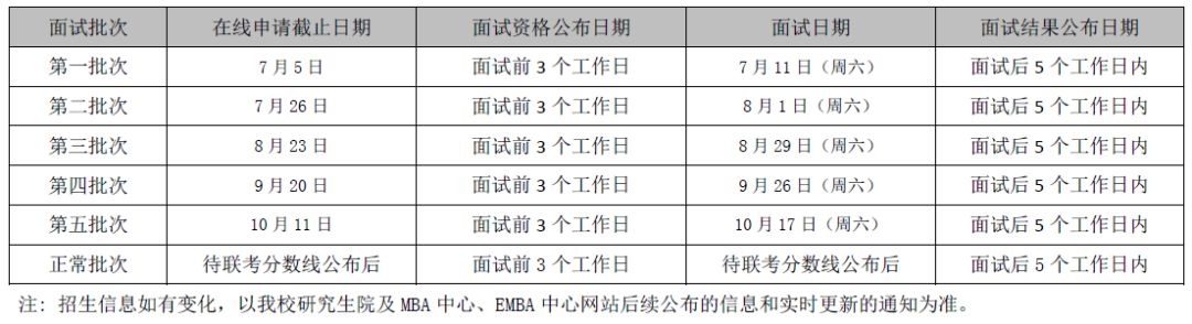 3.在提前批次招生工作階段,申請全日制項目的考生只有一次參與提前批次招生的機會,申請非全日制子項目的考生將擁有多次參與提前批次招生的機會(創新創業MBA實驗班除外)。未參與提前批次招生的考生可直接參加正常批次招考。
