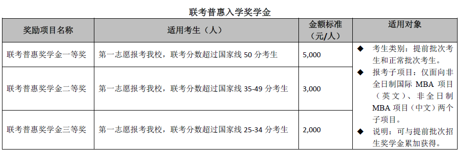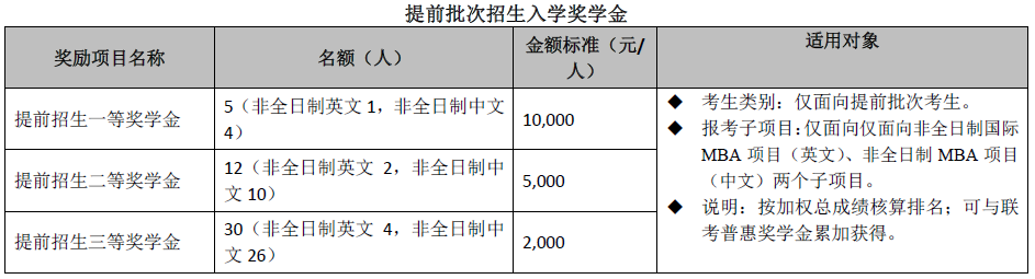 設立四種類別入學獎學金,以資鼓勵報考我校MBA項目、全國聯考初試分數成績優秀、提前批次招生面試表現出色的考生。