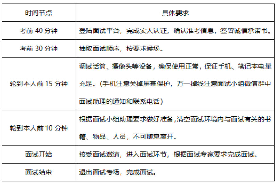 1.面試場地應相對獨立、整潔,保證照明良好、不逆光,環境安靜,可視范圍內不能有任何復試相關資料,不得出現除考生外的其他無關人員。