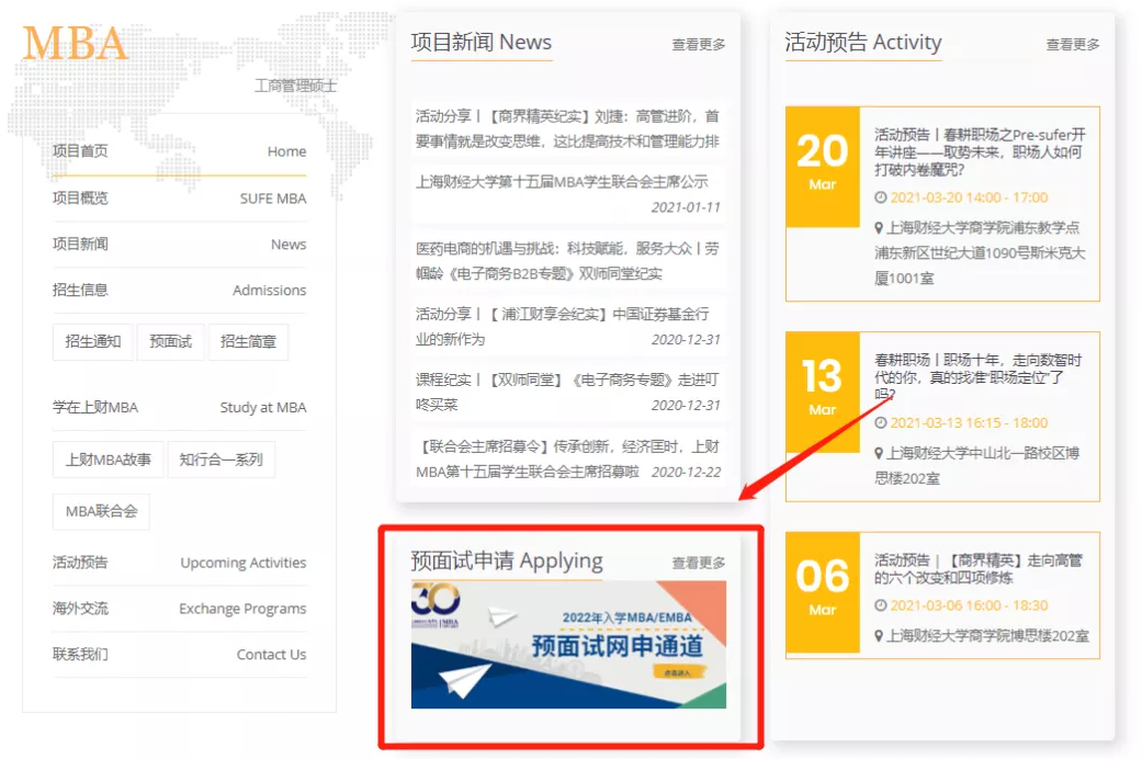 (https://cob.sufe.edu.cn/MBA)點擊“2022MBA預面試申請”(如紅框所示)進入。