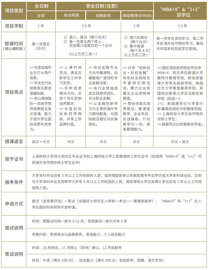 建校于1917年的上海財經大學是中國最早的商學研究高等學府。百年上財,百年商學,一代代上財人銘記“厚德博學,經濟匡時”之校訓,為推動中國現代商業社會進步做出了卓越貢獻。上海財經大學的MBA教育始于1991年,是全國首批試辦MBA的九所院校之一,并在2021年迎來項目成立30周年。而立之年的上海財經大學MBA項目現已通過AMBA國際認證及中國高質量MBA認證(CAMEA),上海財經大學商學院已通過AACSB和EQUIS國際認證。目前,項目在培養體系、師資開發、海外交流、產教結合及學員職業發展等方面銳意進取,全力構建“中國一流、世界知名”的MBA項目。
