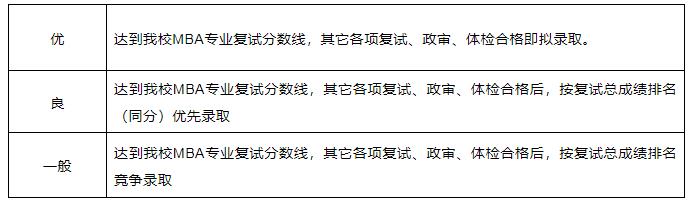 面試結(jié)果分為:優(yōu)、良和一般。優(yōu):預(yù)面試分?jǐn)?shù)為85分以上且不超過預(yù)面試考生比例35%;良:預(yù)面試分?jǐn)?shù)70分以上;合格:預(yù)面試分?jǐn)?shù)60分以上。MBA擬錄取資格對照表如下: