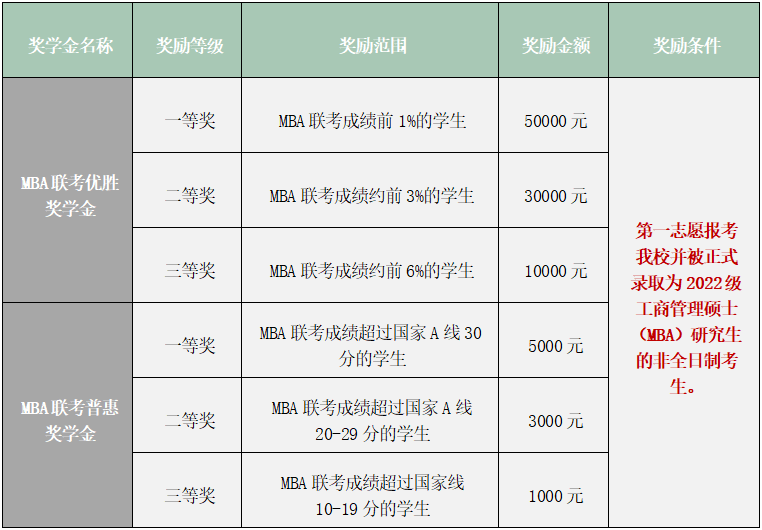 為了鼓勵(lì)優(yōu)秀人才攻讀非全日制工商管理碩士(MBA),培養(yǎng)更多品學(xué)兼優(yōu)的商界精英,北京交通大學(xué)MBA教育中心特設(shè)立MBA聯(lián)考優(yōu)勝獎(jiǎng)學(xué)金、MBA聯(lián)考普惠獎(jiǎng)學(xué)金。其獎(jiǎng)勵(lì)范圍、獎(jiǎng)金額度和獎(jiǎng)勵(lì)對(duì)象如表三所示。若有變動(dòng),均以具體通知為準(zhǔn)。