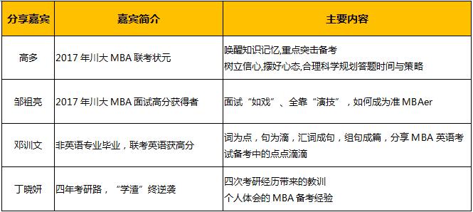 導讀:幫助廣大考生掌握四川大學商學院MBA項目2018年招生政策,提高備考和學習效率,中心將于10月15日舉辦2018年招生說明暨備考經驗分享會。屆時,川大MBA2017年入學聯考狀元、入學獎學金獲得者、通過備考復習成績大幅提升的多名同學將帶來他們寶貴的備考經驗與學習心得分享,歡迎各位考生勇躍參加。因場地有限,參加者須于10月13日中午12:00點前在中心網站上進行預約