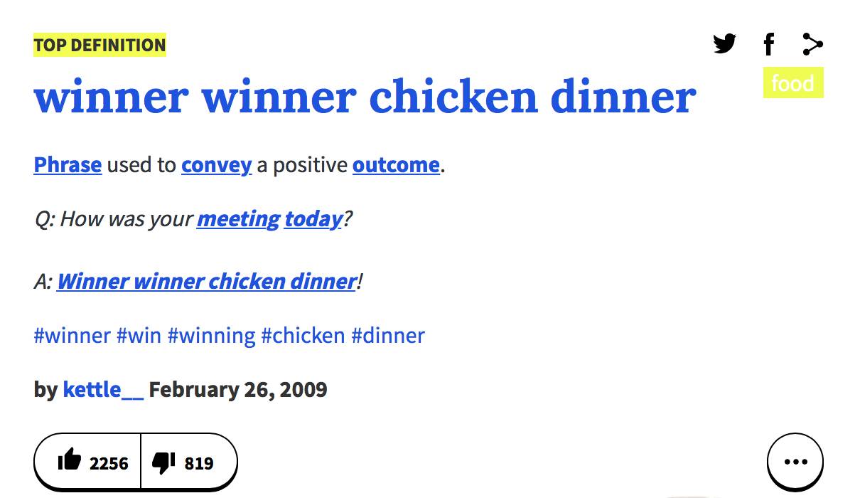 讓我們再回到英文本身:Winner Winner Chicken Dinner,出于本能的反應,我感覺這一定又是英文中的某個俚語。