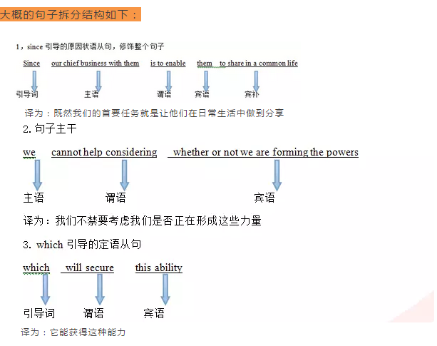 搞清楚各句段之間的意義及修飾關系,最后就可以整合語言了,該句話可以譯為:既然我們的首要任務就是讓他們在日常生活中做到分享,因此我們不禁要考慮我們是否正在形成獲得這種能力的力量。