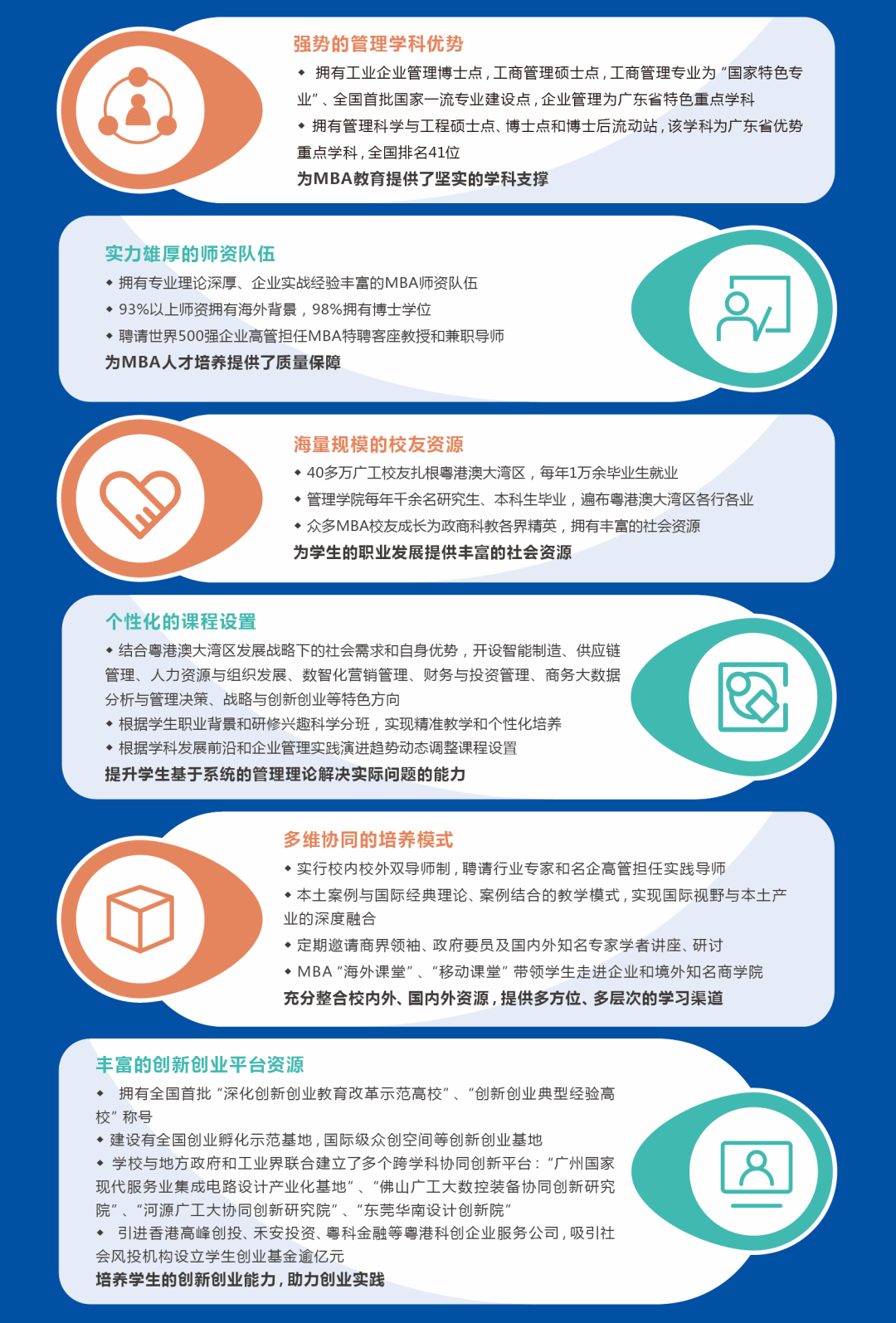 廣東工業(yè)大學(xué)MBA項(xiàng)目以培育具有責(zé)任擔(dān)當(dāng)(responsible)、崇法尚德(ethical)、勇于創(chuàng)新(innovative)、勤勉務(wù)實(shí)(diligent)的REID型商界精英為使命,依托工商管理、管理科學(xué)與工程的學(xué)科優(yōu)勢(shì)以及廣東工業(yè)大學(xué)的工科特色,關(guān)注粵港澳大灣區(qū)在現(xiàn)代物流、現(xiàn)代金融服務(wù)、國(guó)際商業(yè)貿(mào)易等產(chǎn)業(yè)發(fā)展實(shí)踐中面臨的突出問(wèn)題,緊扣管理學(xué)理論與實(shí)踐的國(guó)際前沿,努力形成特色鮮明的商科與理工、文法等學(xué)科交叉融合的MBA人才培養(yǎng)體系,以實(shí)現(xiàn)管理學(xué)院“打造立足粵港澳灣區(qū)、具有國(guó)際化視野、與產(chǎn)業(yè)深度融合的一流商學(xué)院”的愿景。