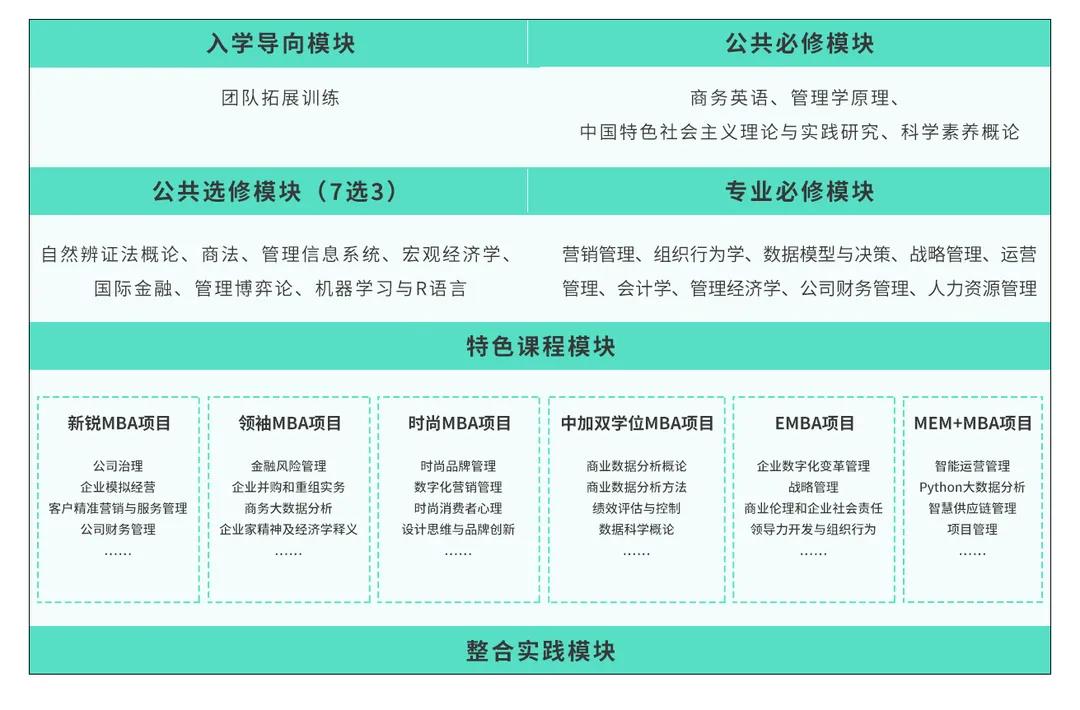 ①專業課程設置,管工深度融合。MBA跨界MEM培養模式,緊密圍繞“管理+工程”的核心理念,精選MBA經典課程,增設MEM前沿課程,涵蓋智能運營管理、Python大數據分析、智慧供應鏈管理、項目管理、商務智能建模與優化算法等課程。