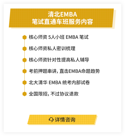 | 清北EMBA | 直通車班 | 29.98萬 | 30萬 | 全程校長師資跟蹤 材料修改 全真模擬面試密訓 拿到一所院校的錄取通知書 報名需評估,全國限招10人 |
